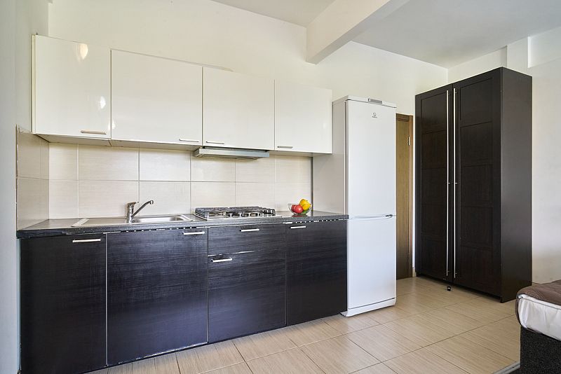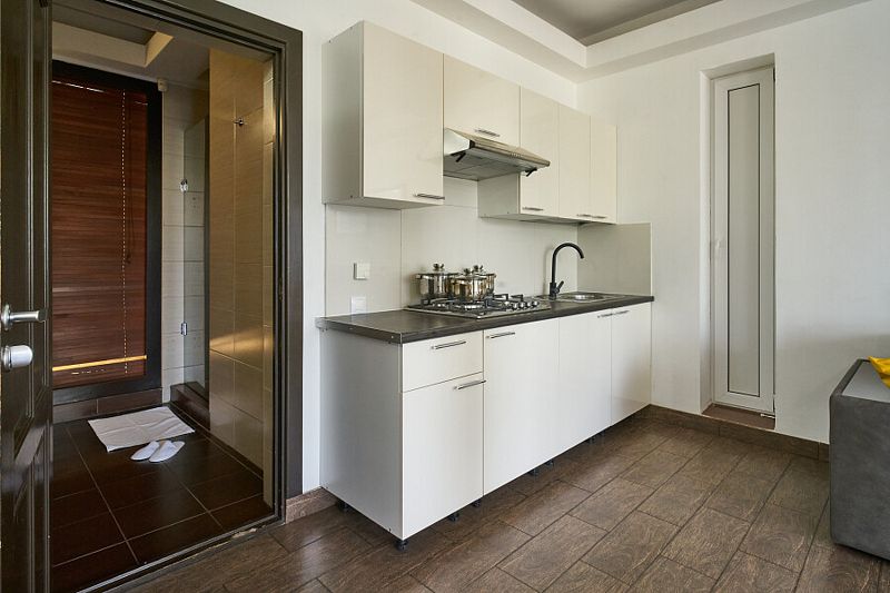 В номере: Диван кровать, собственная полноценная кухня с газовой варочной панелью на 4 конфорки, холодильник, стол, стулья, набор посуды и столовые принадлежности, чайник, шкаф, ТV с плоским экраном и HDMI входом, кондиционер,постельное белье, набор полотенец, диспенсер с гель-шампунем, собственная ванная комната с санузлом.