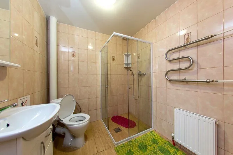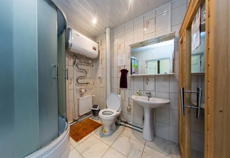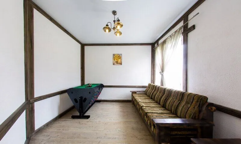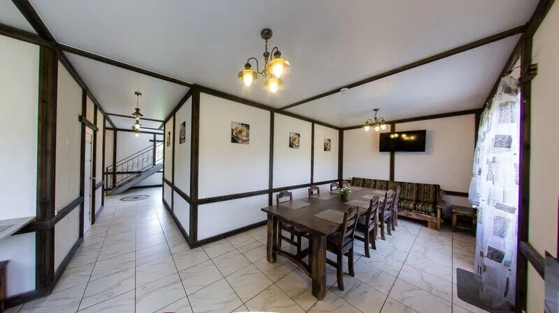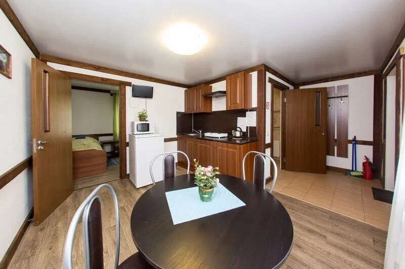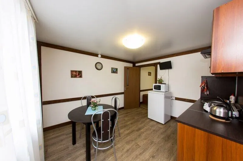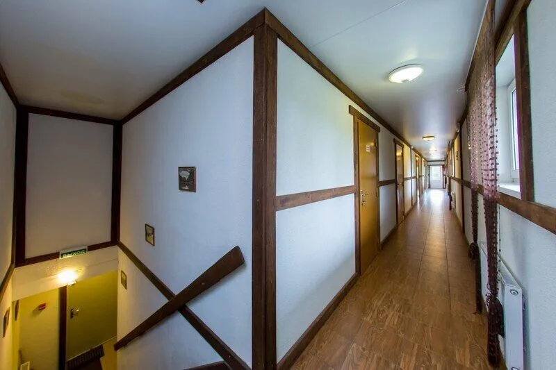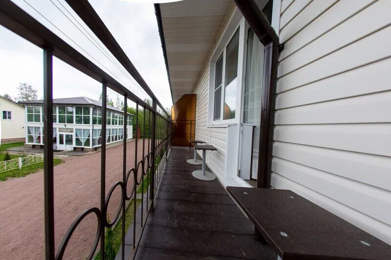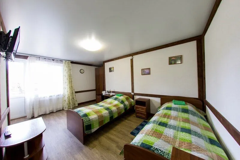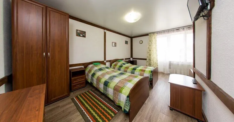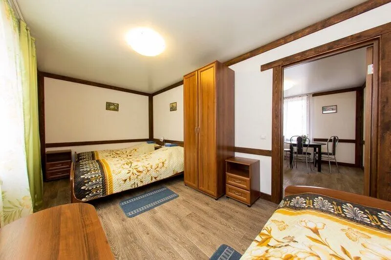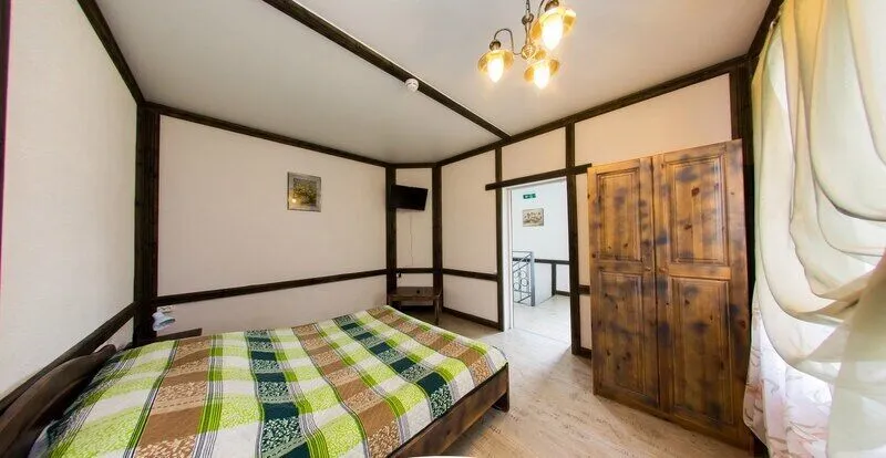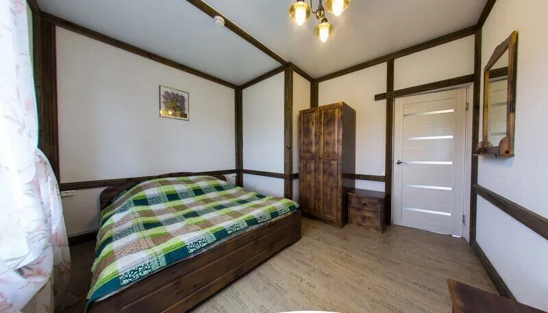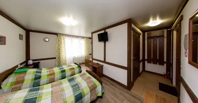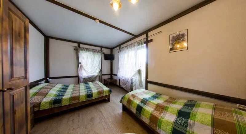 Три двухместных номера на 1-ом этаже. Один двухместный номер на втором этаже(вход в номер через улицу по лесенке). Удобства в отапливаемом туалете на улице. Все номера оборудованы холодильником, TV, чайником и микроволновой печью.