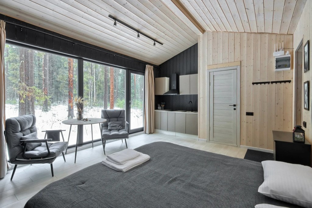 Уютные коттеджи с панорамными окнами позволяют вдоволь насладиться открывающимся видом в любое время года.