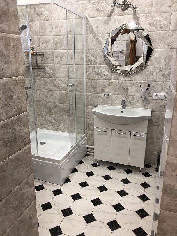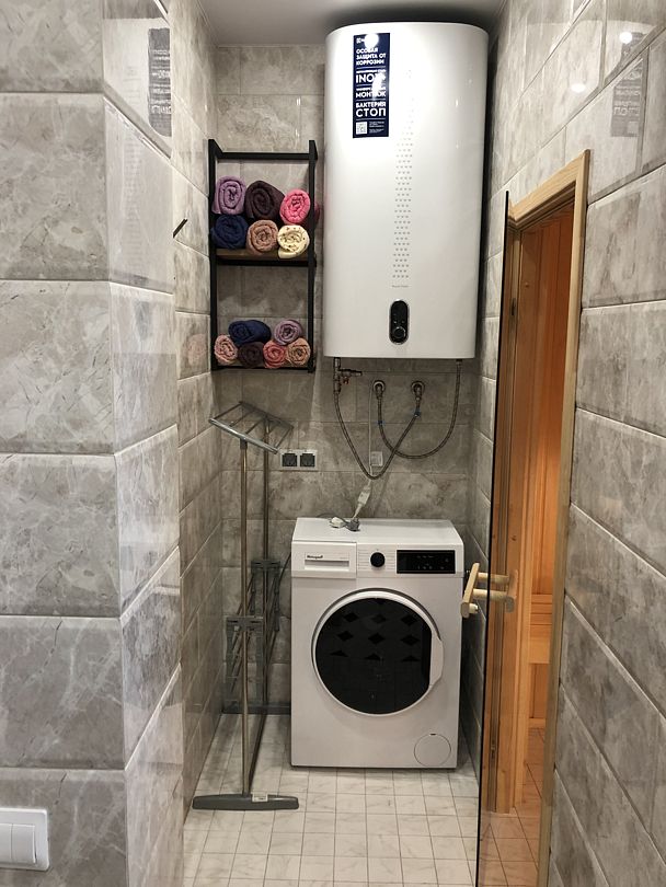 Гости также могут воспользоваться сауной с электрической каменкой. В санузле выделена зона для стирки.