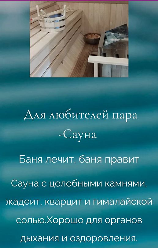 Сауна с целебными камнями, жадеит, кварцит и гималайской солью.Хорошо для органов дыхания и оздоровления.