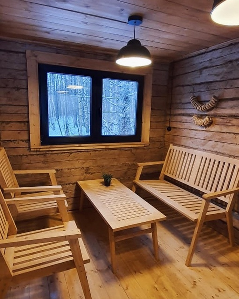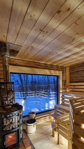 Деревянный сруб, парная с панорамным окном на Вуоксу и дровяной печью, комната отдыха, душевая.