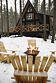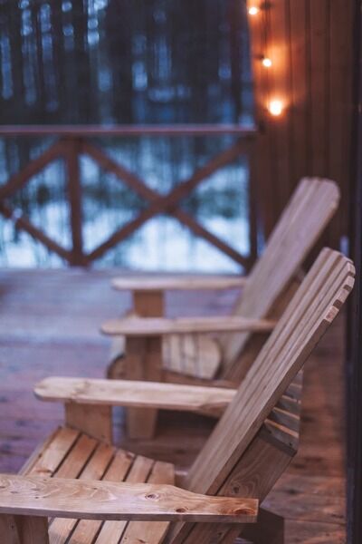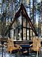 На террасе установлена купель, рядом с домом — мангал и зона с креслами для отдыха у костра. Дом вмещает двух гостей плюс три дополнительных места.