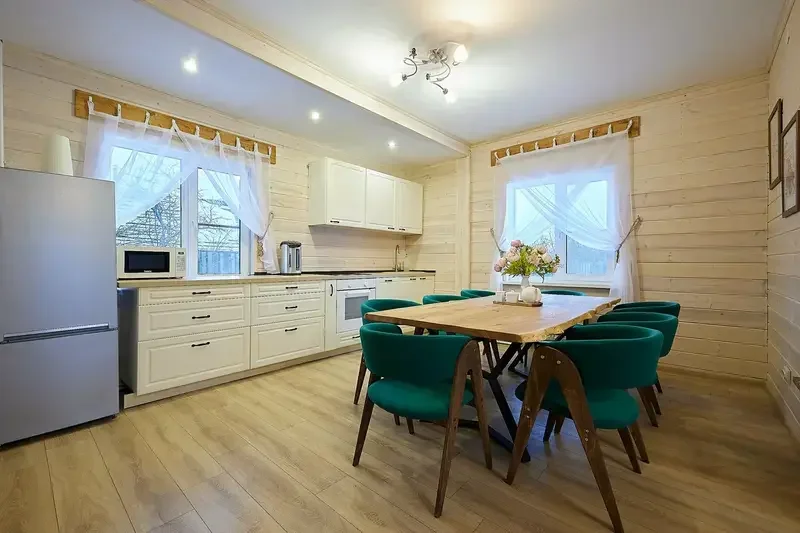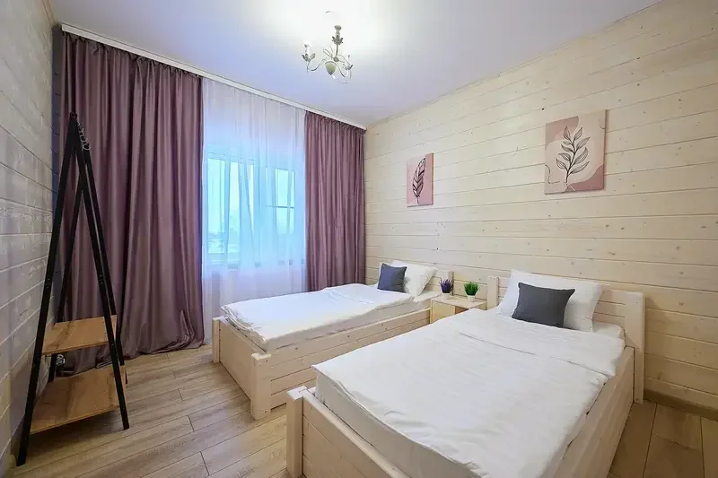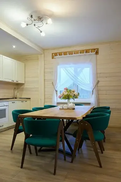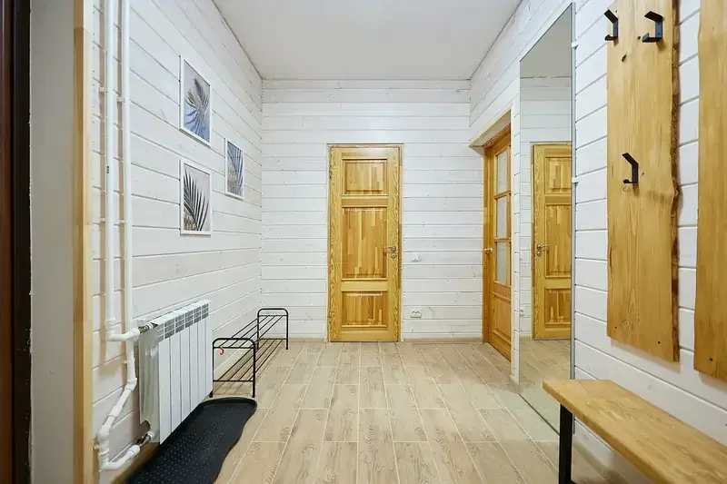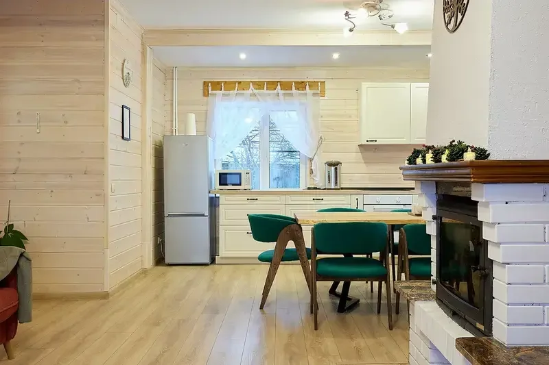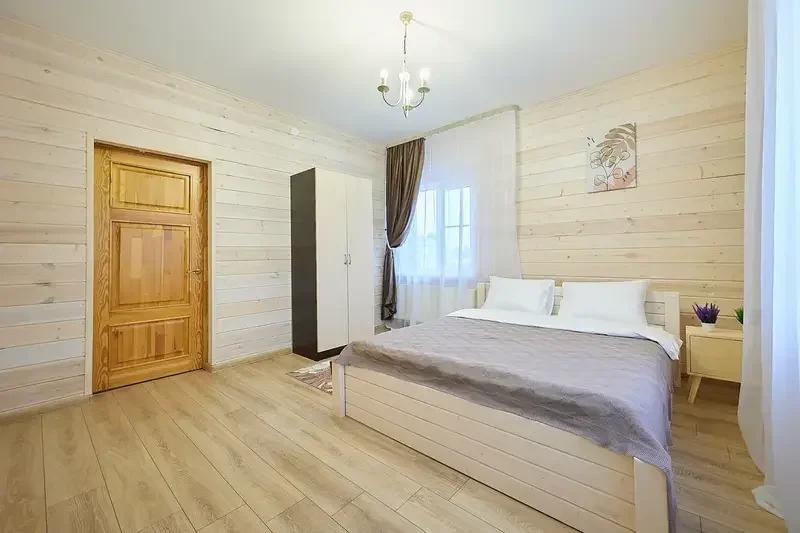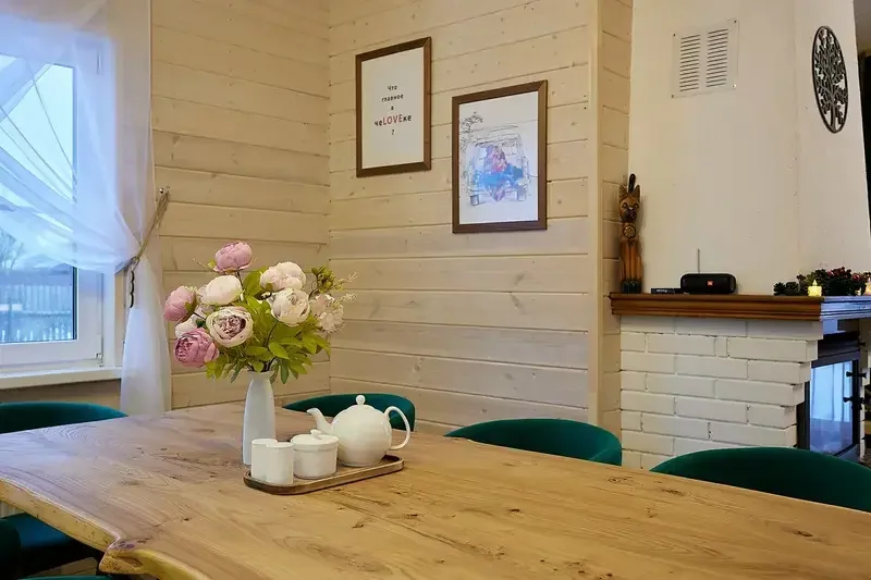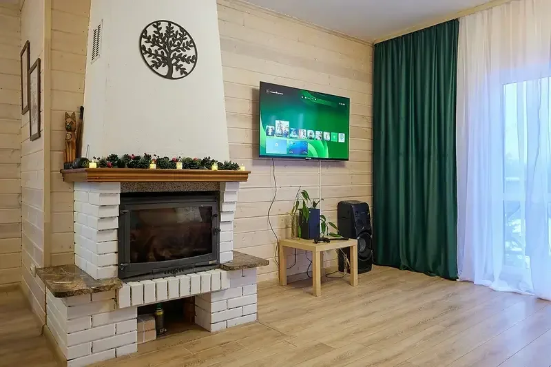 Вместительный дом предлагает комфортное размещение до семи взрослых гостей, с возможностью дополнительных мест. На первом этаже имеется вся необходимая кухонная утварь, гостиная зона с телевизором и игровая комната для детей. Второй этаж оборудован четырьмя спальнями и санузлом. Дом оснащен Wi-Fi, электрическим отоплением и имеет свою баню на дровах и мангал на территории.