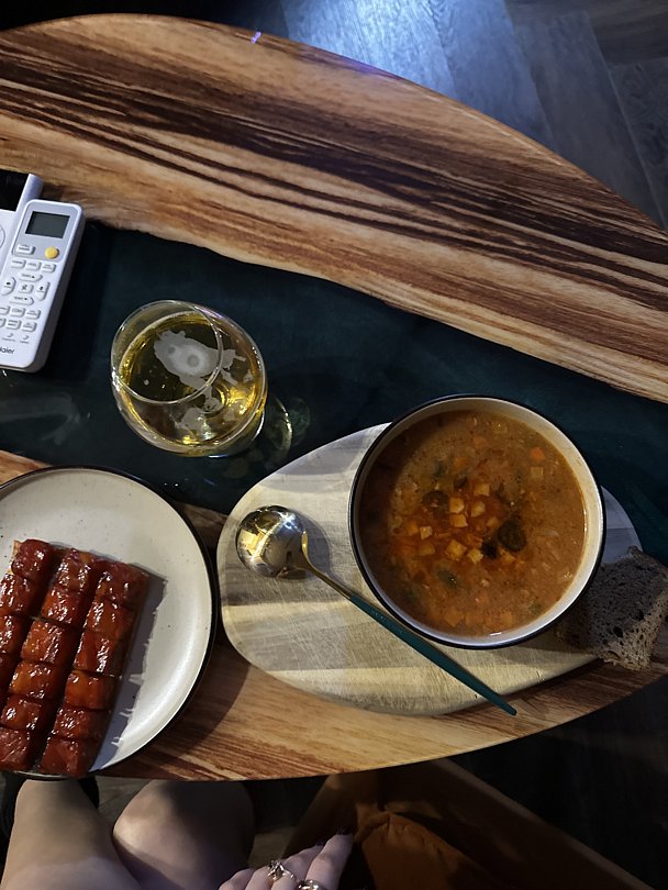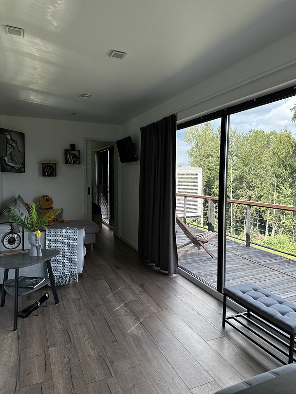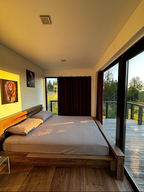 Для проживания гостей на территории подготовлено три коттеджа, каждый из которых — это продуманное пространство для уединения и перезагрузки. Стильные интерьеры, естественные материалы, мягкий свет, панорамные окна с видом на сосновый лес, современная ванна — всё это создано для вашего комфорта. У каждого домика имеется собственная терраса с мангальной зоной, шезлонгами и костровой чашей. Все домики оснащены центральным отоплением, бойлерами, а также кухней, оборудованной бытовой техникой и набором посуды. Бесперебойный скоростной интернет в каждом коттедже.