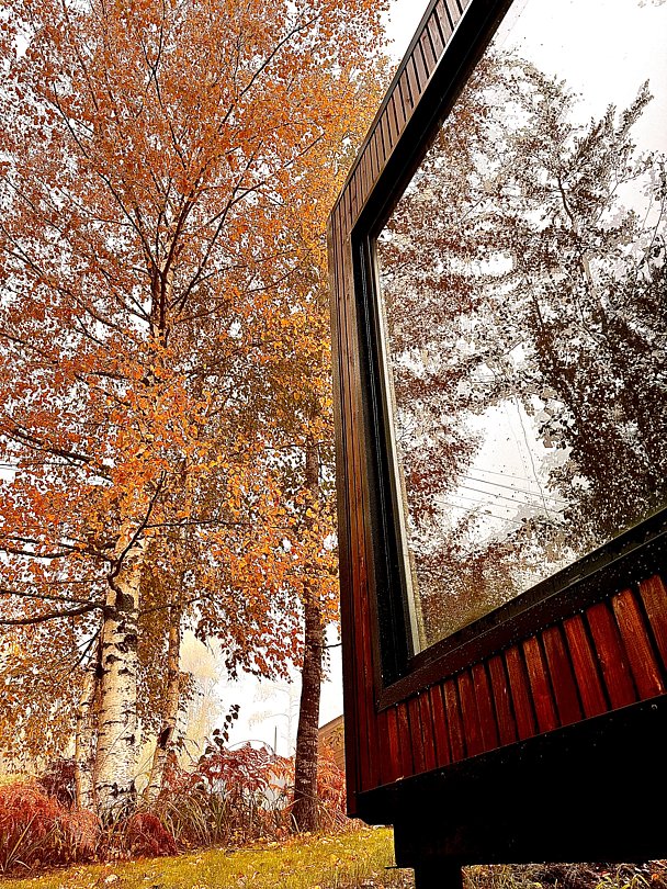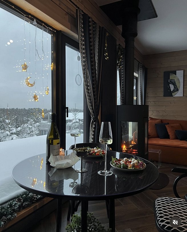 Домик с панорамными окнами, стеклянным камином и проектором.