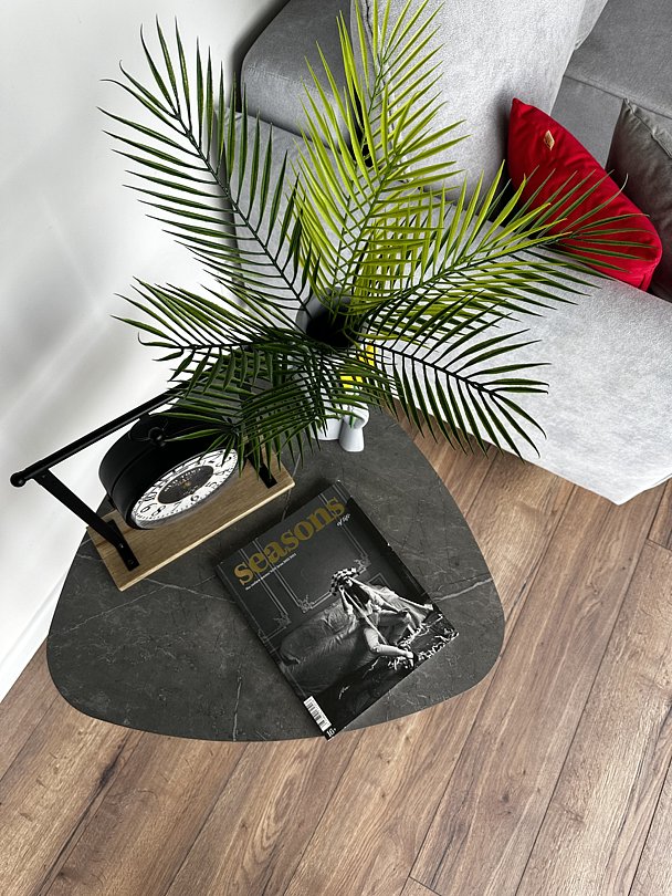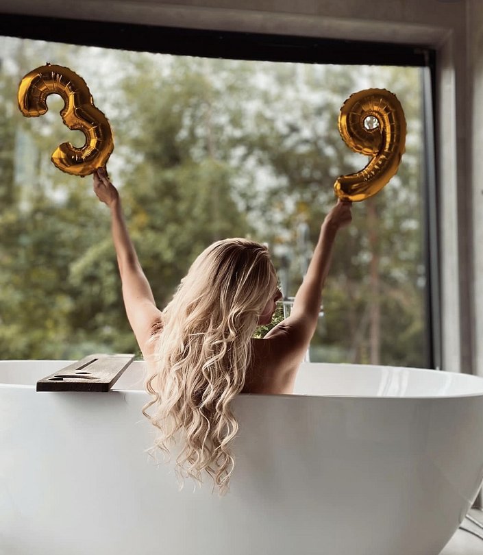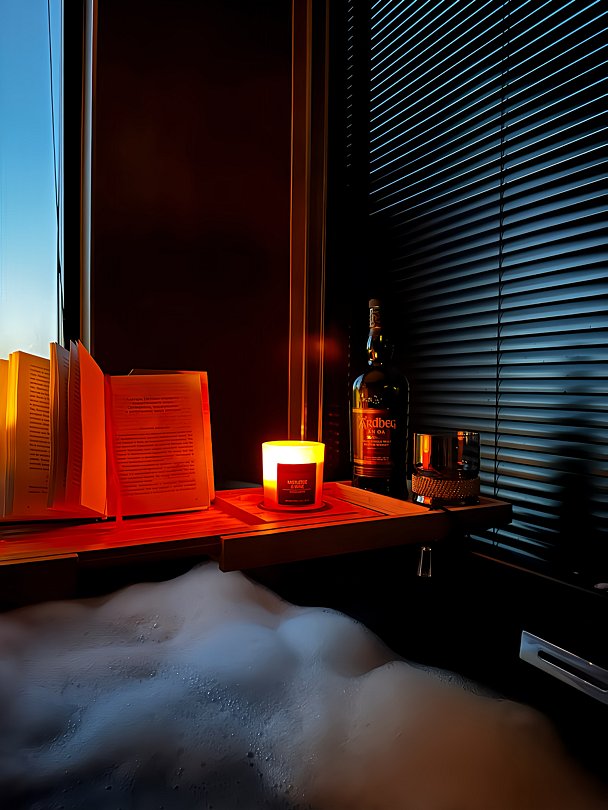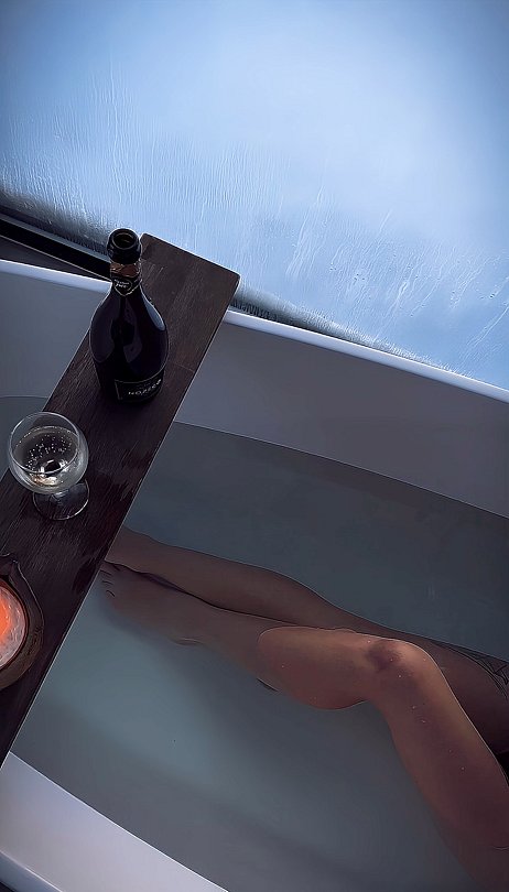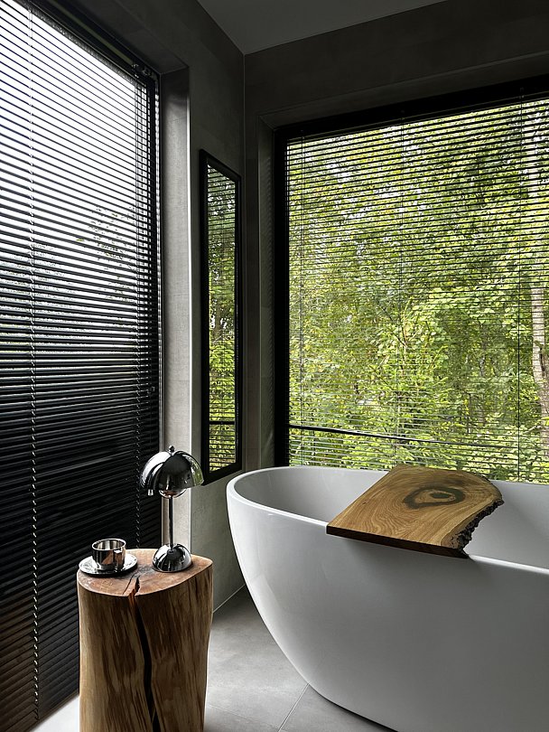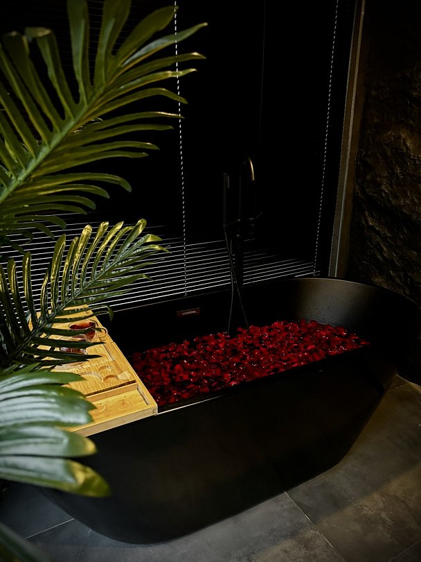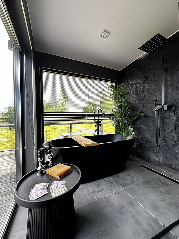 Домик с панорамной отдельно стоящей черной ванной, тропическим душем и гавайской черной скалой из арт бетона, над которой работала художник Анна В.