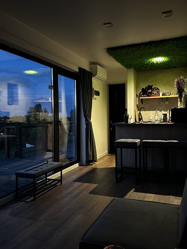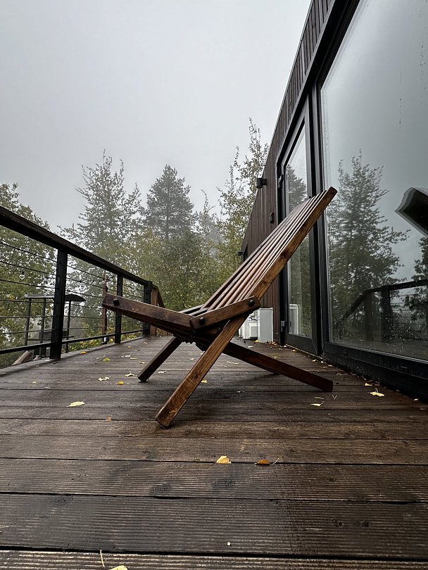 У домика имеется своя собственная терраса, мангальная зона (патио) с шезлонгами, костровой чашей для любителей погреться у костра и подсветкой из лофт гирлянды для более романтичного времяпровождения.