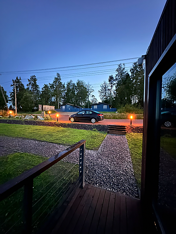 Для гостей домика есть освещаемая лофт светильниками парковка.