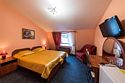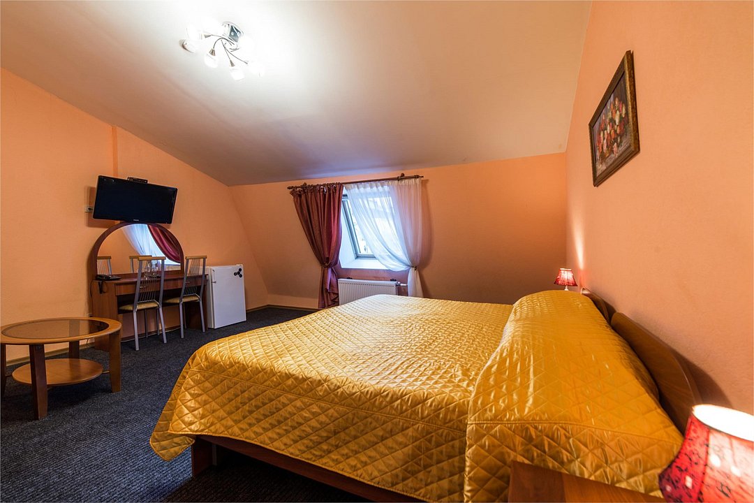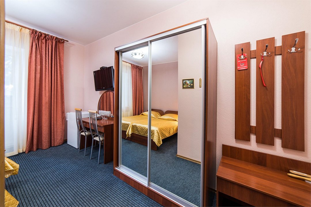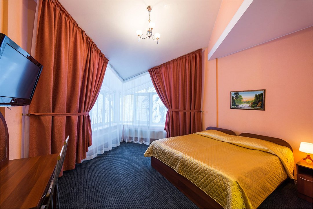 телевизор, спутниковое телевидение, Wi-Fi, телефон, холодильник, светильник, фен, ванная комната, ванна, банные полотенца, двуспальная кровать, тумбы, стулья, шкаф для одежды, письменный стол, багажная тумба, зеркало, письменные принадлежности, обслуживание номеров, информационная карта, меню, унитаз, раковина, кулер на этаже, вид на лесВ номере