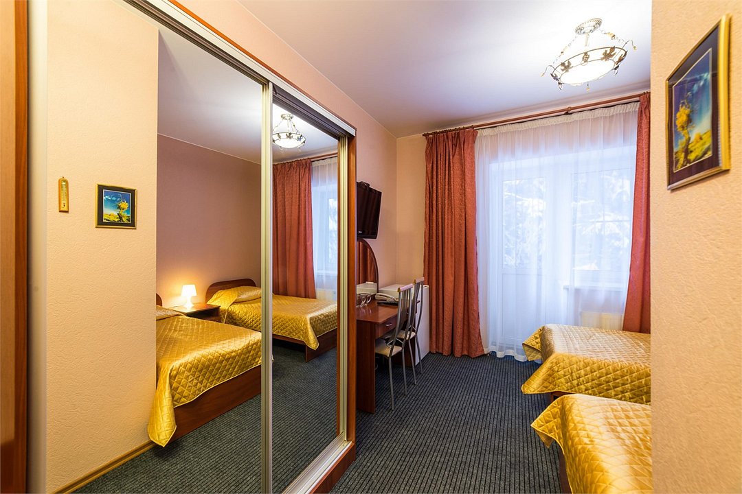 телевизор, кабельное телевидение, Wi-Fi, телефон, холодильник, светильник, настольные лампы, ванная комната, ванна или душевая кабина, санузел, банные полотенца, две односпальные кровати, кресла, тумбы, стулья, шкаф для одежды, вешалки, письменный стол, зеркало, мини-бар, письменные принадлежности, обслуживание номеров, информационная карта, меню, вид на лесВ номере