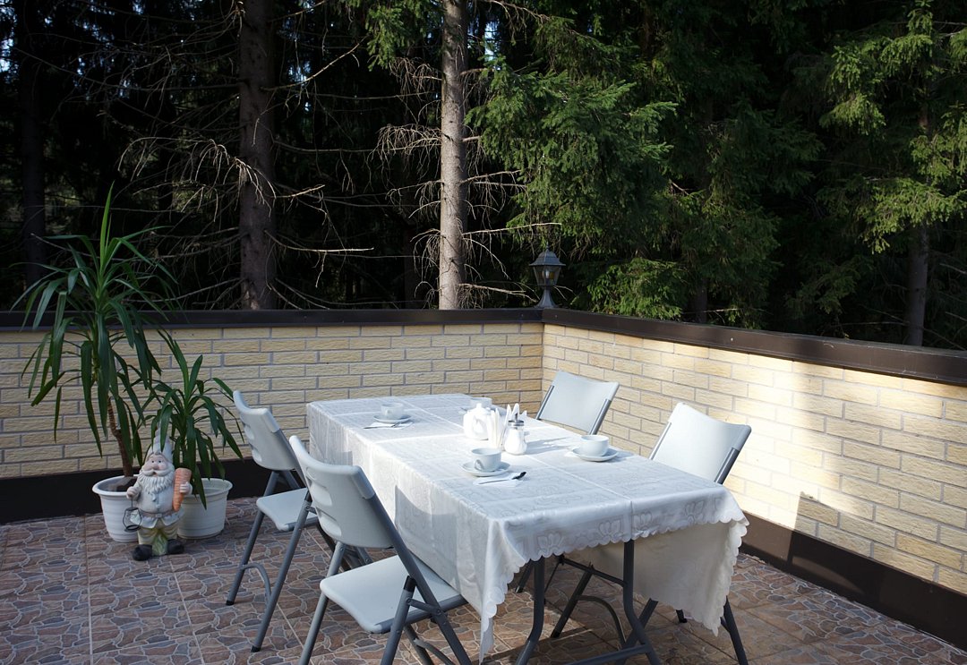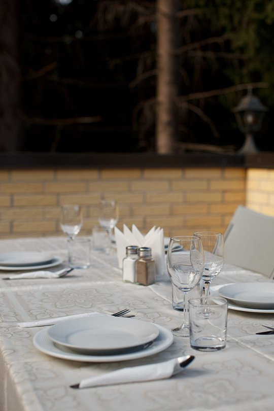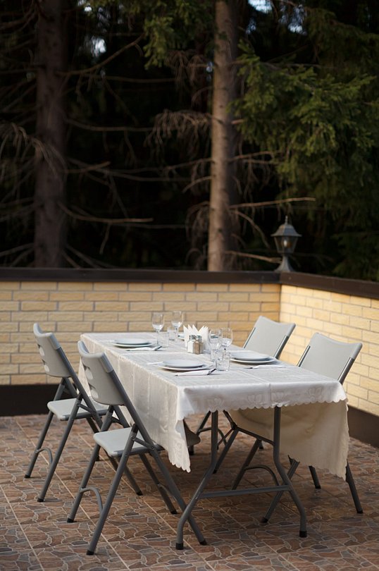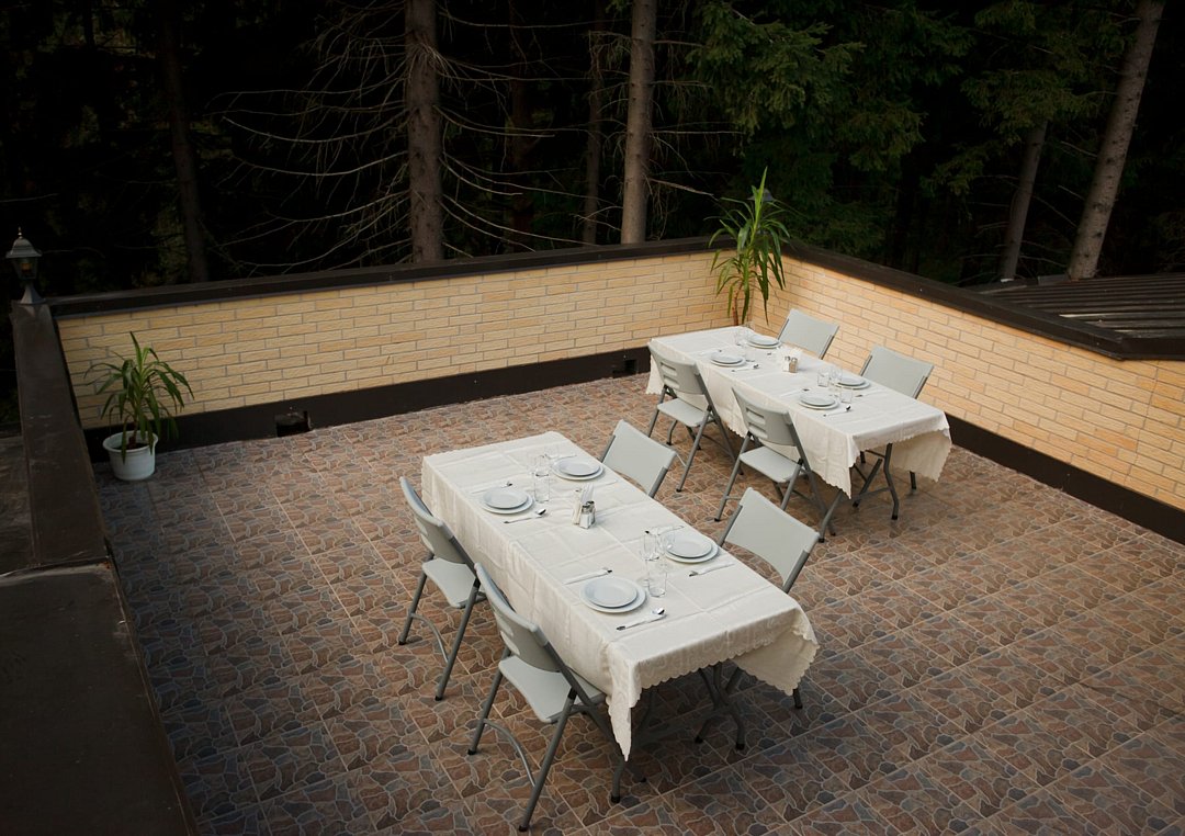 Открытая веранда — идеальное место для проведения завтраков и обедов, а также для организации торжественных мероприятий: дней рождения, свадеб, вечеринок и выпускных балов. Гости имеют возможность арендовать дополнительный столик с шестью стульями, а также мангал, включающий уголь и розжиг.