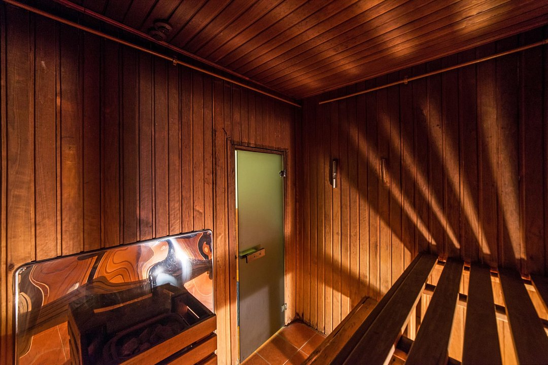 Инфраструктура: бассейн, зона отдыха, душ, чай/угощенияСауна включает жаркую финскую парную, а также теплый двухуровневый бассейн с современной системой очистки воды и декоративной подсветкой. Для комфорта гостей предусмотрены душевая, две просторные комнаты отдыха с удобной деревянной и мягкой мебелью, ЖК-телевизоры, DVD-плееры и самовар для чаепития.