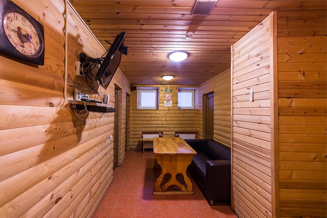Инфраструктура: зона отдыха, простыни, обливное ведро, душМинимальное время аренды: 2 часаВ бане предусмотрена русская парная, возможность контрастного обливания из бочки, а также уютная комната отдыха с самоваром и ЖК-телевизором. Для гостей, проживающих в «Домике Охотника», утреннее посещение бани включено в стоимость проживания: с 7:00 до 10:00 в будние дни и до 11:30 — в выходные.