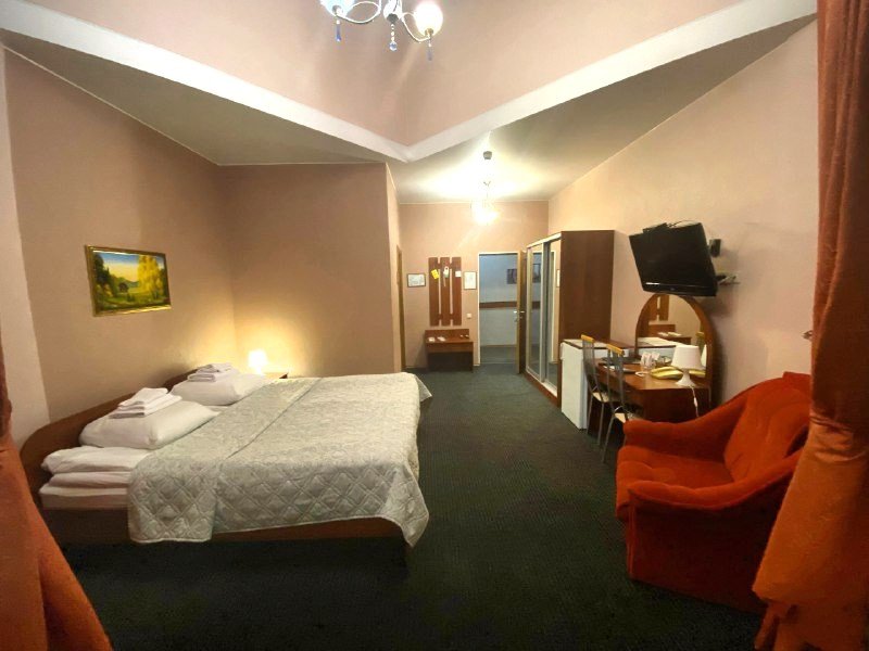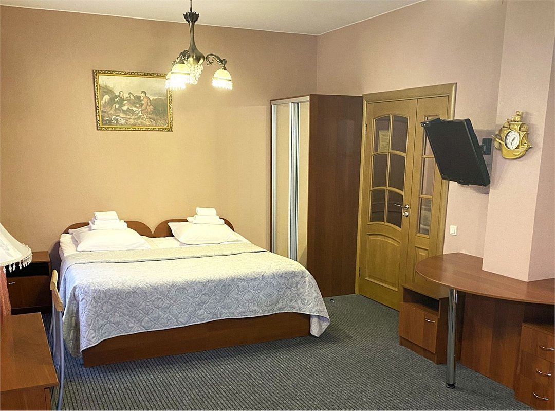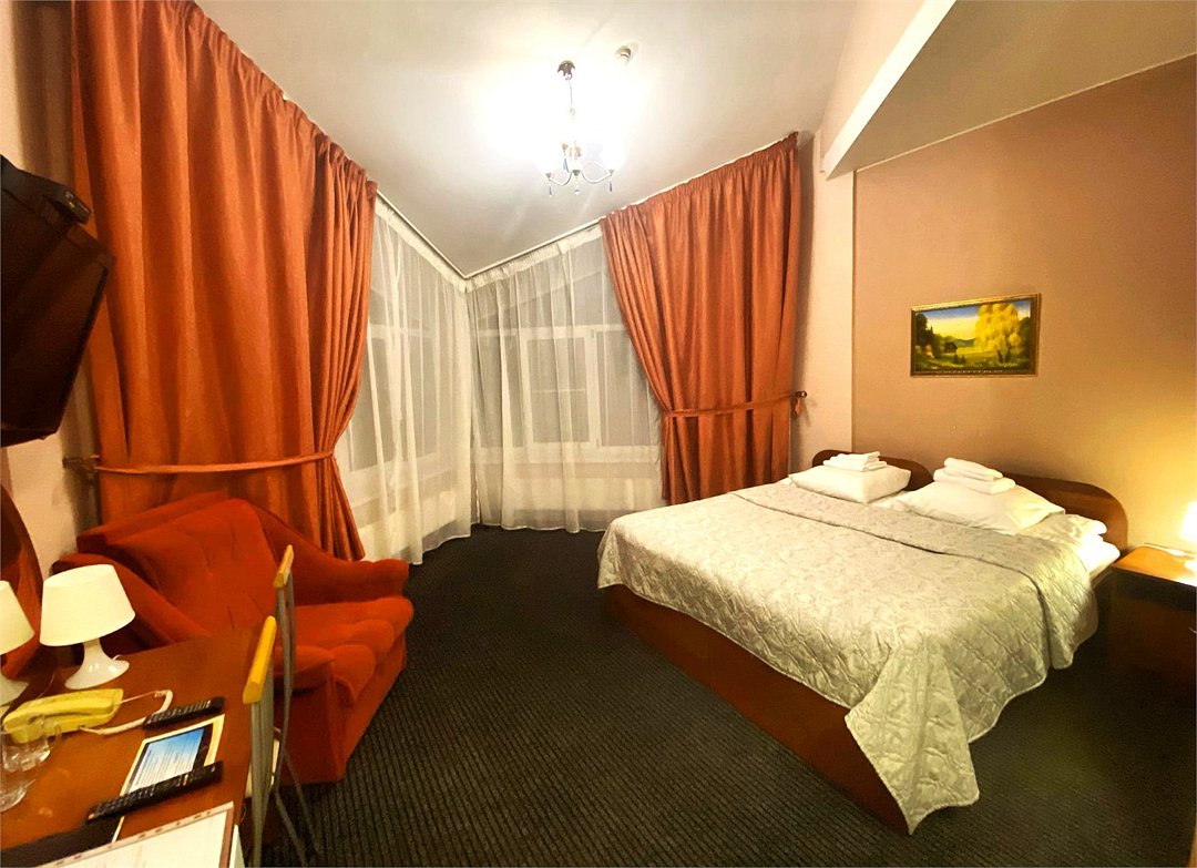 телевизор, спутниковое телевидение, Wi-Fi, телефон, холодильник, светильник, фен, ванная комната, ванна, банные полотенца, двуспальная кровать, тумбы, стулья, шкаф для одежды, письменный стол, багажная тумба, зеркало, письменные принадлежности, обслуживание номеров, информационная карта, меню, унитаз, раковина, кулер на этаже, вид на лесВ гостиничном номере