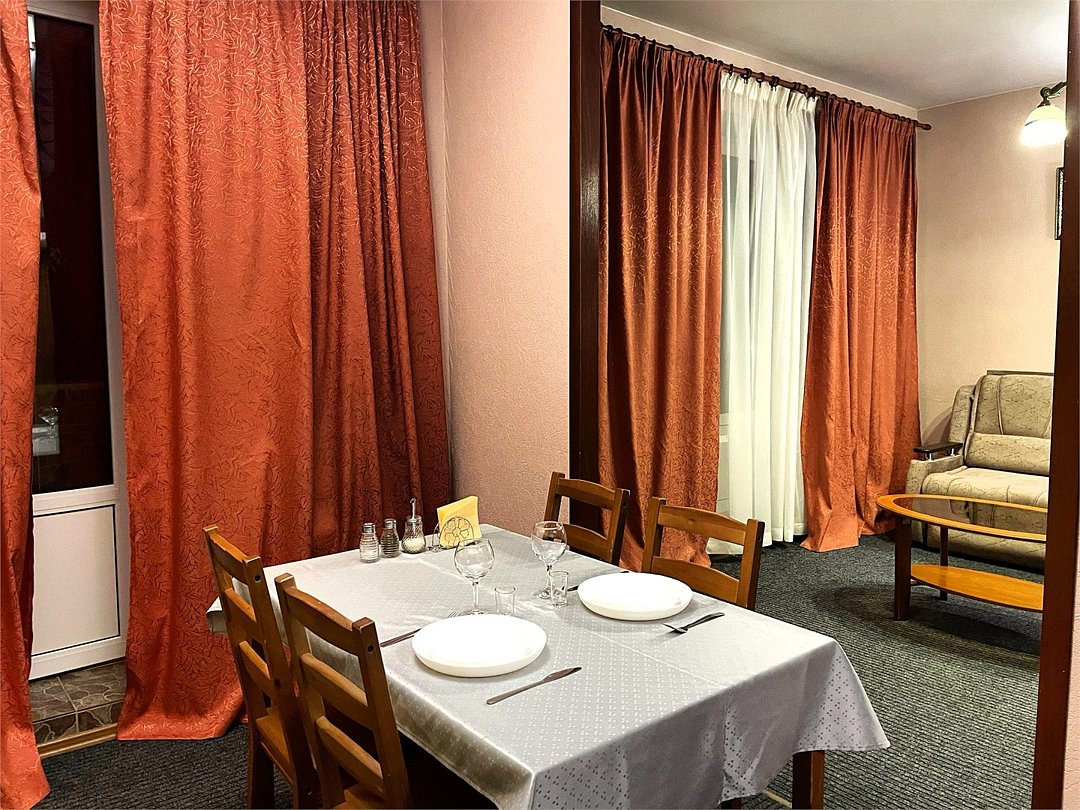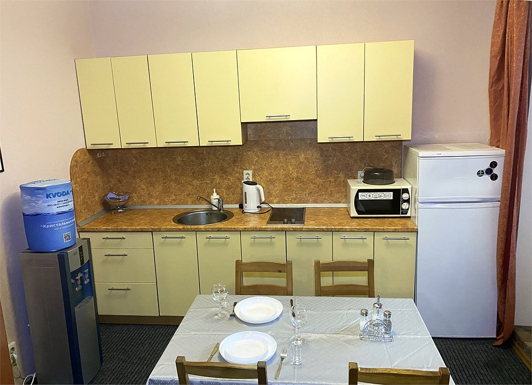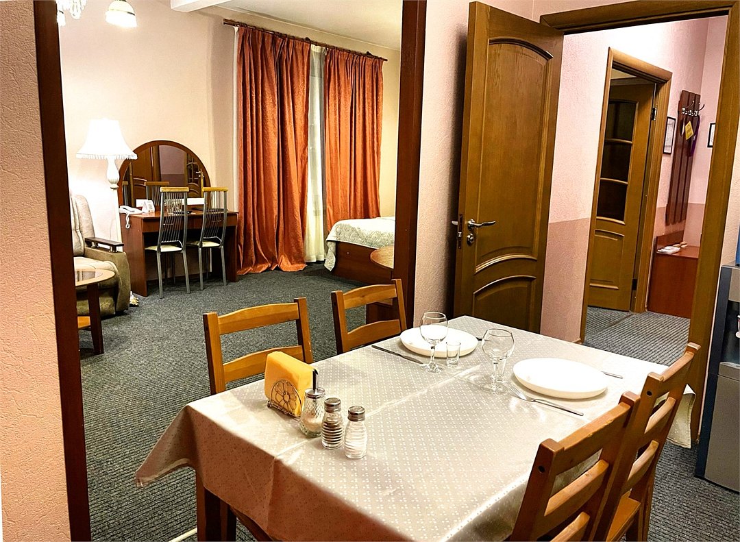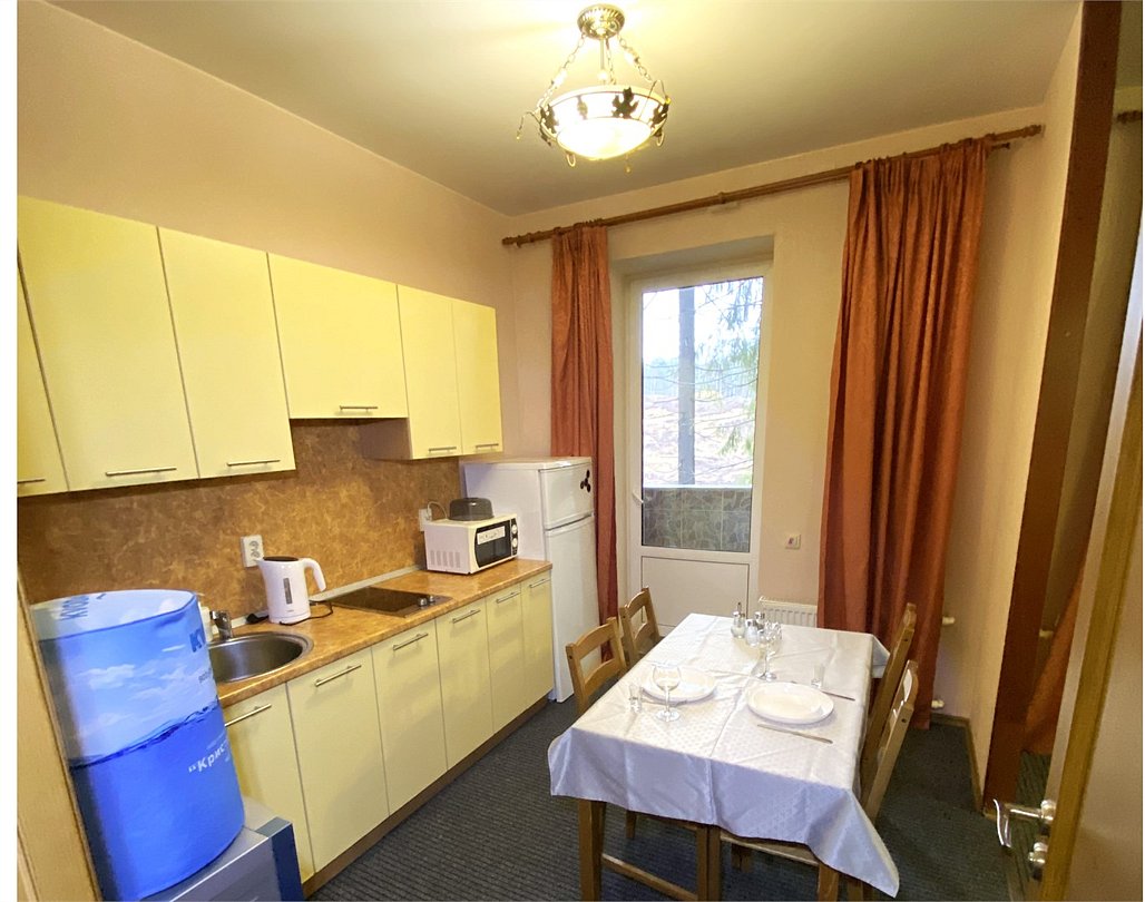 Просторные номера с кухней и балконом, выполненные в мягких пастельных тонах. Количество номеров – 1 Однокомнатные апартаменты с кухней - двухместное размещение В номере: двуспальная кровать, 1 раскладное кресло, двуспальный диван, 2 прикроватные тумбы, плазменная панель, телефон, холодильник, трюмо, 2 стула, шкаф-купе (принадлежности для одежды и обуви), душевая кабина с гидромассажем, косметические принадлежности, комплект полотенец + халаты, тапочки и фен, мини-бар, кухня оборудована всем необходимым: чайник, микроволновая печь, кулер с холодной и горячей водой В стоимость проживания входит: - Посещение утренней сауны с двухуровневым бассейном и бани. В будние дни — с 7:00 до 10:00, в выходные до 11:30; - Пользование террасой с мангалом; - Wi-fi. Размещение взрослых и детей на дополнительных местах оплачивается согласно прайсу в зависимости от категории выбранного номера. Информацию о стоимости необходимо уточнить у отеля. Все детские кроватки и дополнительные кровати предоставляются за дополнительную плату (согласно прайсу отеля) при наличии возможности. В некоторых номерах разрешено проживание с животными. Доплата за проживание с собакой в Токсово - 600 руб/сутки за карманную собаку (до 30 см); 1000 руб/сутки за большую собаку (от 30 см) + залог 5000 руб. (вносится наличными). При заселении в отель каждому гостю необходимо предъявить документ удостоверяющий личность (паспорт). Для детей до 14 лет необходимо предъявление свидетельства о рождении. Для заселения несовершеннолетних детей без родителей необходимо предъявить нотариально заверенную доверенность (для детей до 14 лет доверенность должна быть на сопровождающее лицо, для детей старше 14 лет доверенность может быть оформлена на ребенка).Услуги и удобства