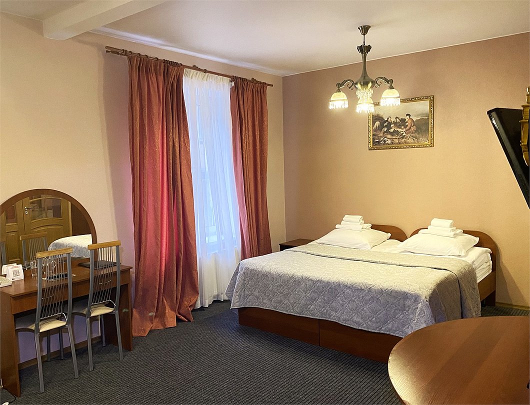телевизор, кабельное телевидение, Wi-Fi, телефон, холодильник, светильник, настольные лампы, ванная комната, душевая кабина, санузел, банные полотенца, балкон, две односпальные кровати, тумбы, стулья, шкаф для одежды, вешалки, письменный стол, зеркало, письменные принадлежности, обслуживание номеров, информационная карта, менюВ гостиничном номере