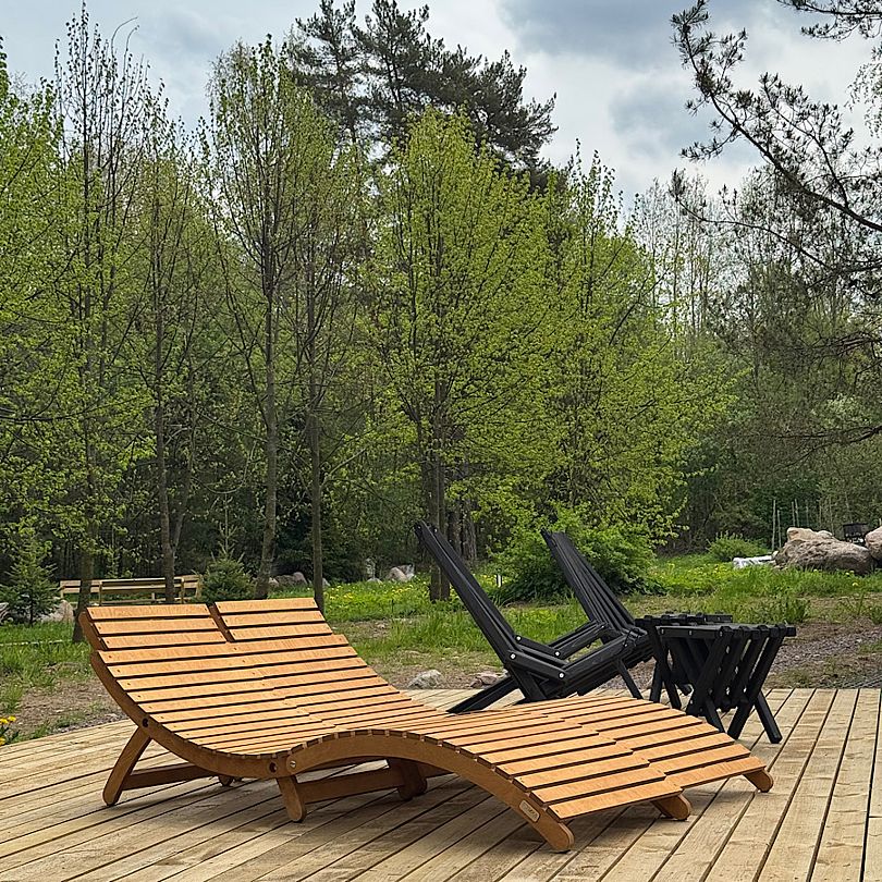 На улице два кресла-шезлонга на посидеть утром с чашечкой кофе, а рядом с домом уличный стол с лавками на всю вашу компанию и мангальная зона. И буквально в двух шагах от коттеджа терраса с шезлонгами, на сваях нависающая над озером и вход в прогулочную зону в лесу.