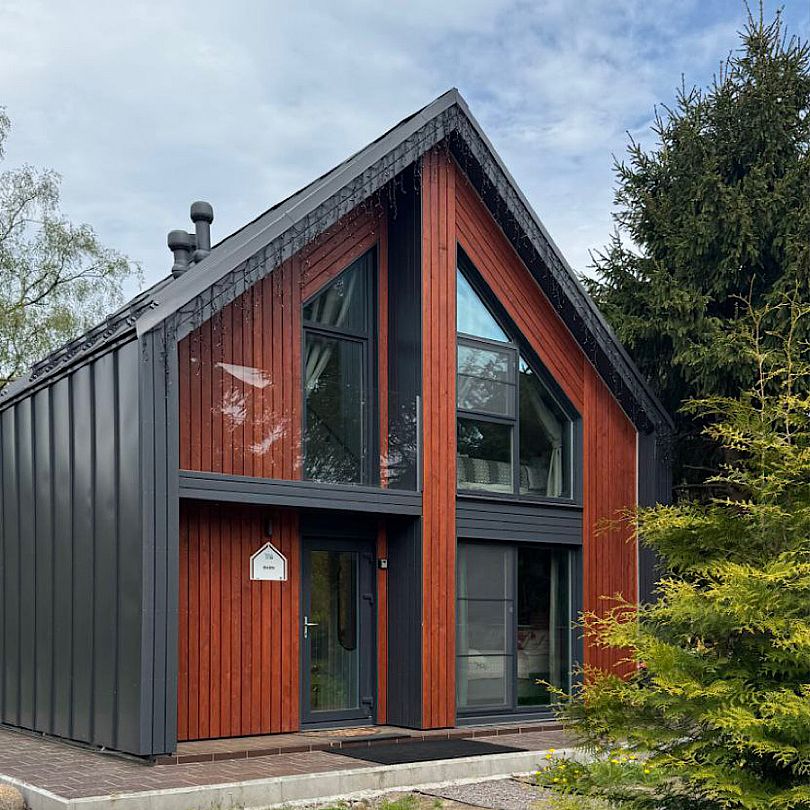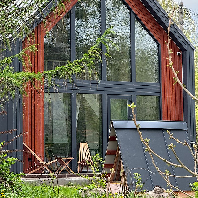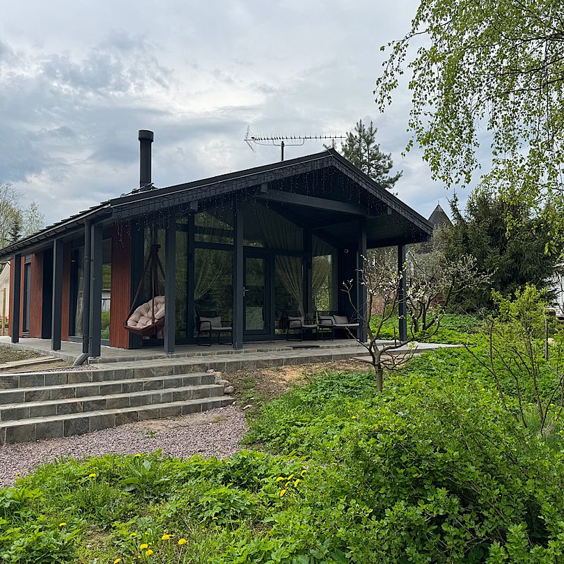 Уютный дом на 2 спальни с панорамной гостиной, выходящей на липовую аллею, озеро и лес.