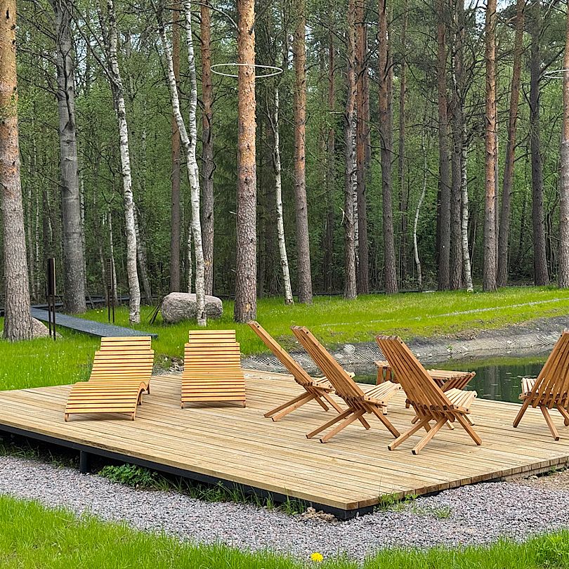 - терраса на сваях над озером с шезлонгами, спуск в прогулочную зону по лесу;