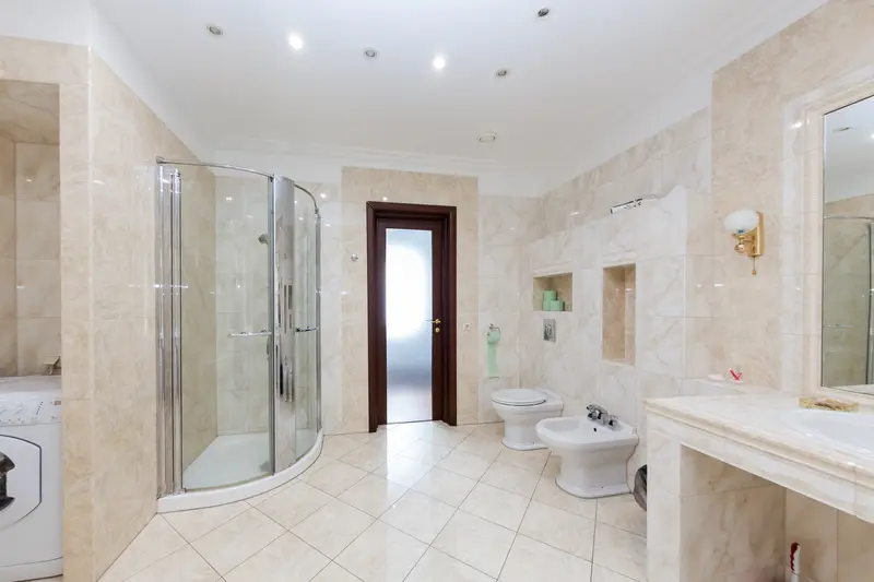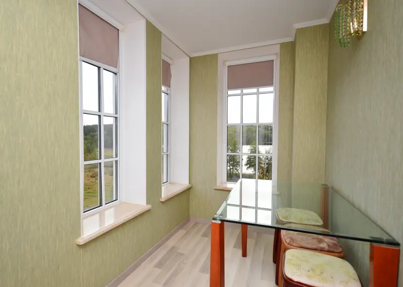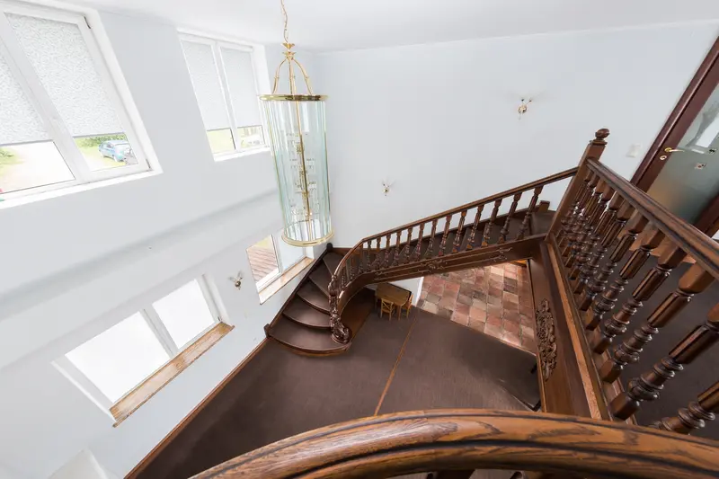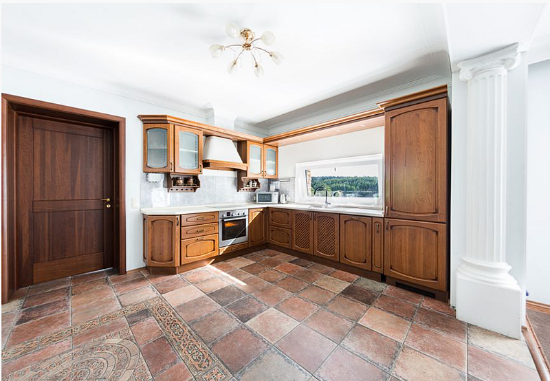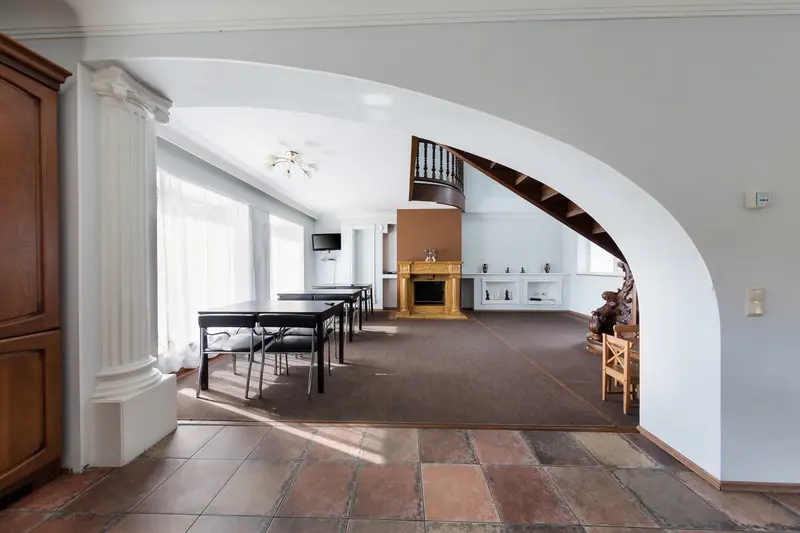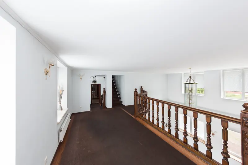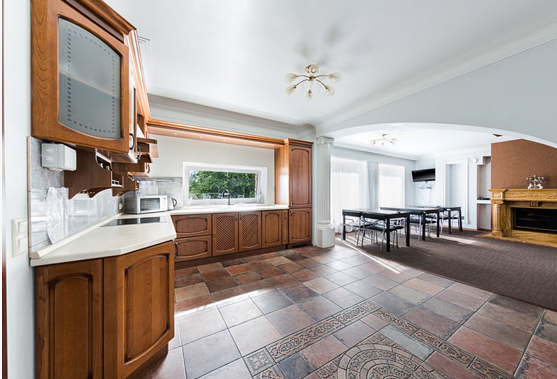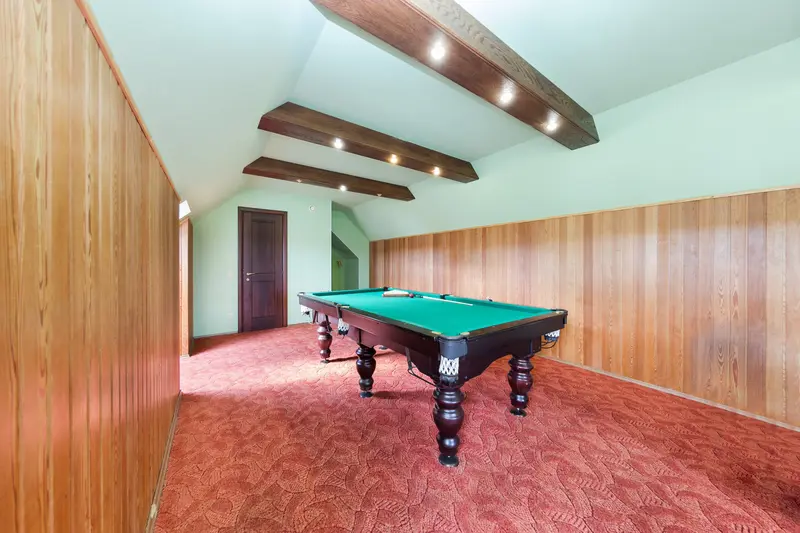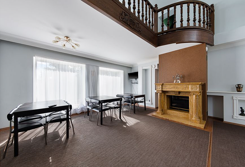 В коттедже 3 этажа повышенной комфортности. На первом этаже расположен банкетный зал с панорамными окнами с видом на озеро, с шикарным камином и изумительной лестницей, все вместе придает залу королевский вид. Кухня полностью оборудована по последнему слову техники. Пять меблированных комнат, санузелы и джакузи, бильярдная комната, всевозможные настольные игры, караоке, TV, DVD, и игровая зона для детей.