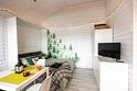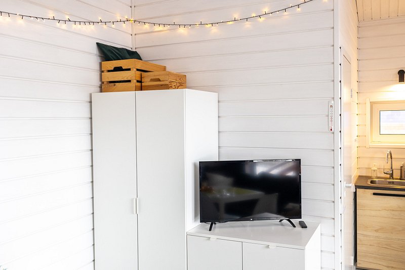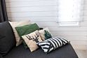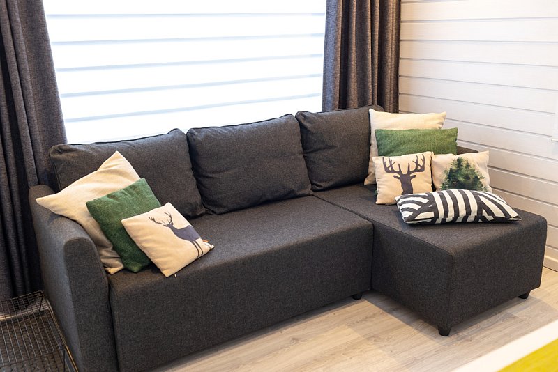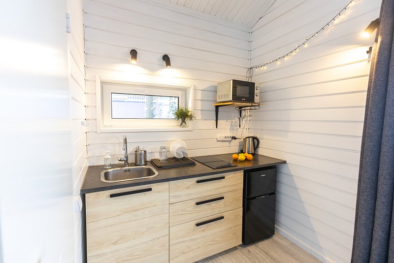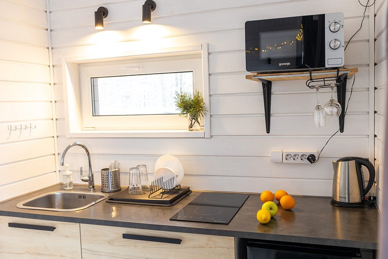 Коттедж со светло-зеленым интерьером лесной атмосферы и оленями на подушках предполагает комфортное размещение до 4 человек. Спальные места: полноценная двухспальная кровать (шкаф-кровать), раскладной диван. Оборудованная для самостоятельного приготовления пищи кухня.