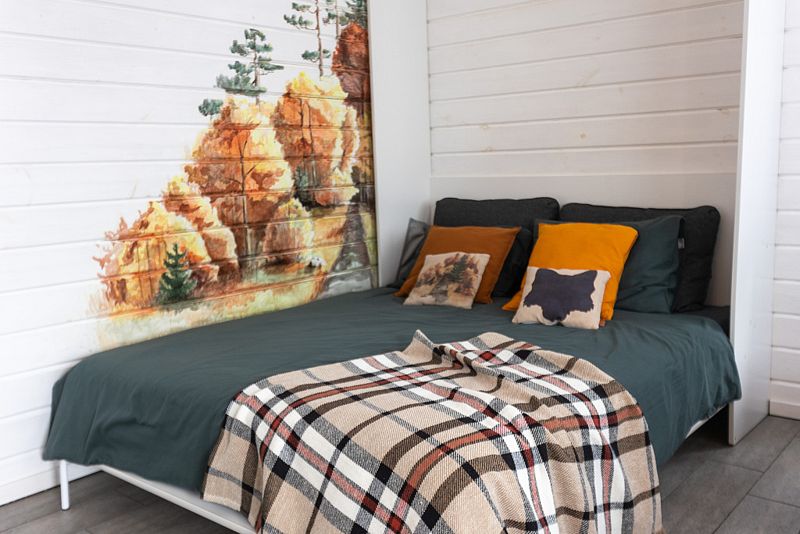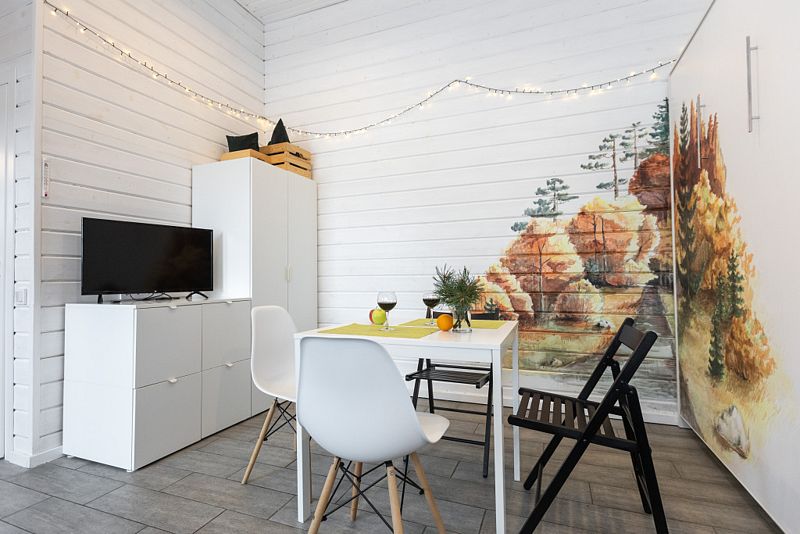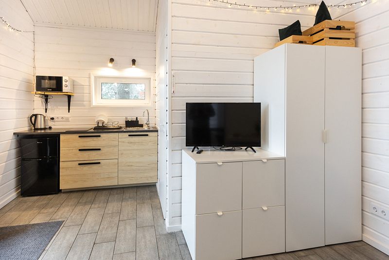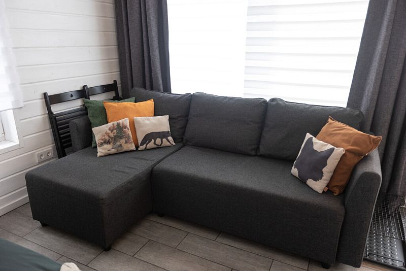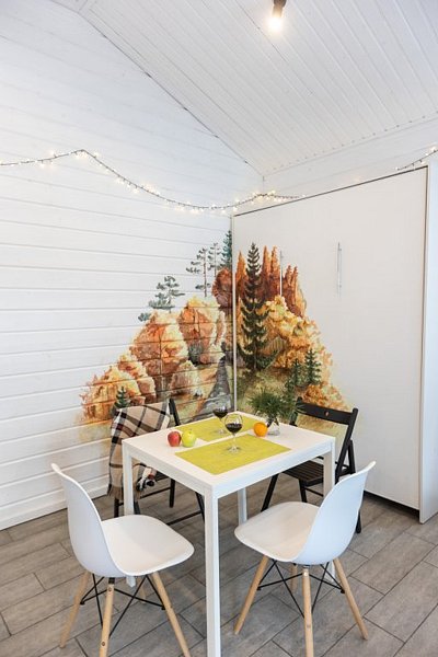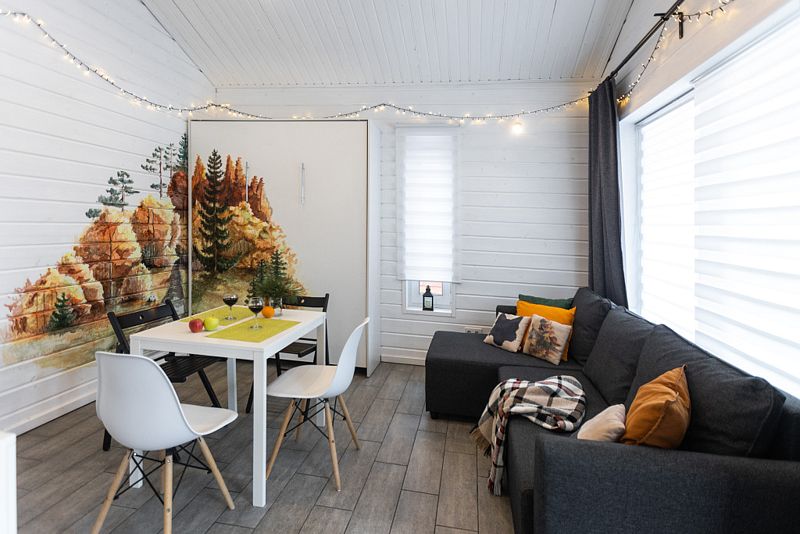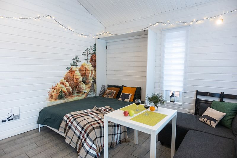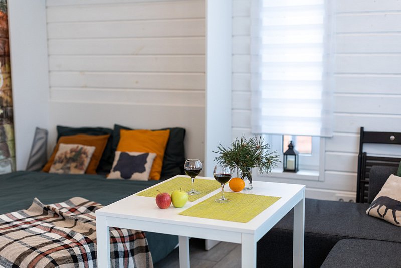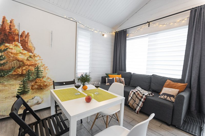Дом - студия Fox Nose " - с интерьером в теплых тонах и лисичками на подушках! Каждый из домиков предполагает комфортное размещение до 4 человек! Спальные места: полноценная двухспальная кровать( шкаф-кровать); раскладной диван.