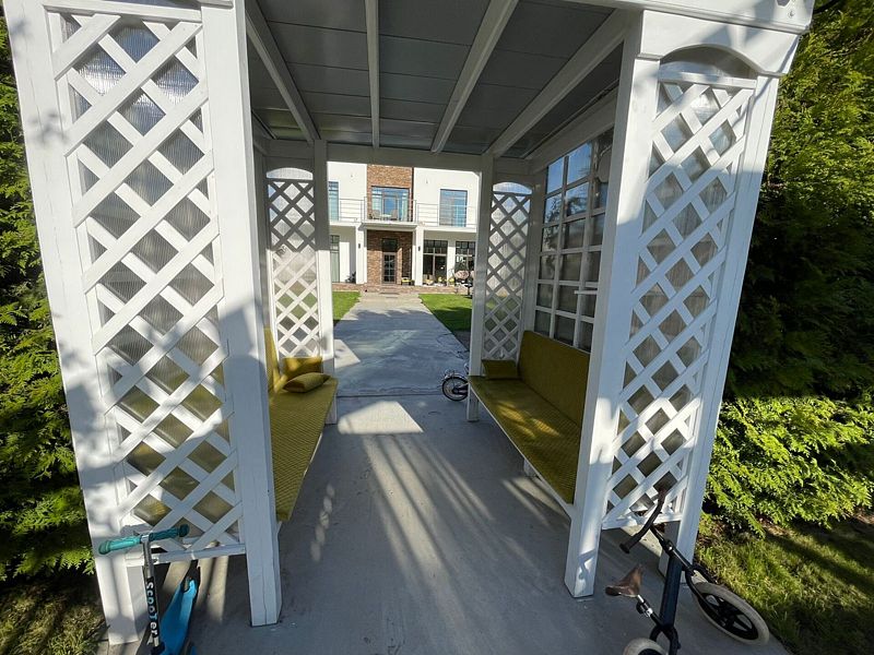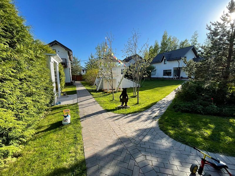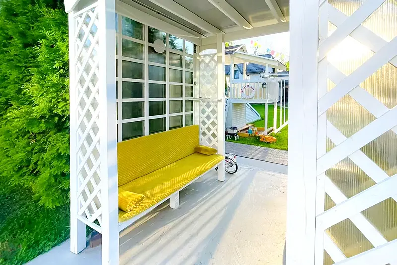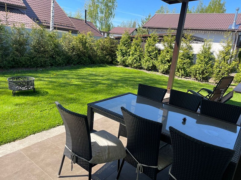 У дома собственная огороженная территория. Здесь предусмотрены гриль зона, терраса с креслами, затененные скамеечки для отдыха, новая, современная и безопасная детская площадка — это целый корабль для юных пиратов.