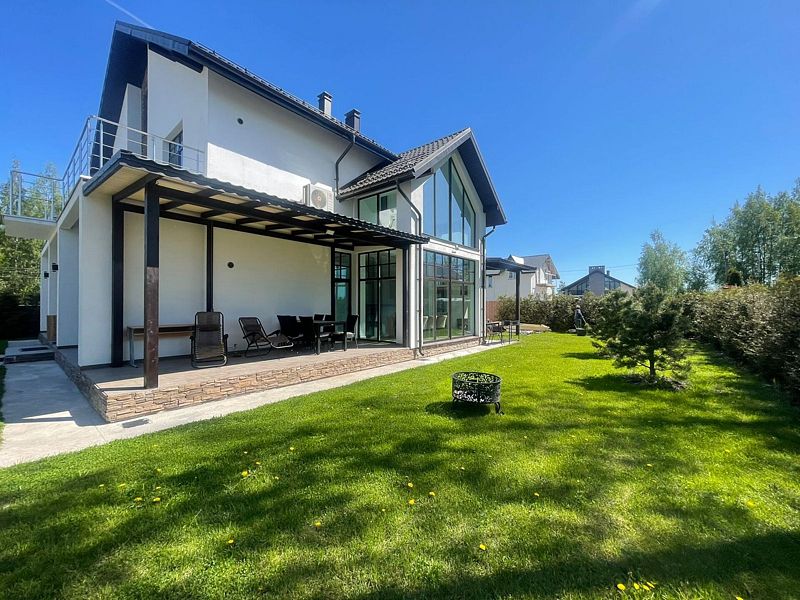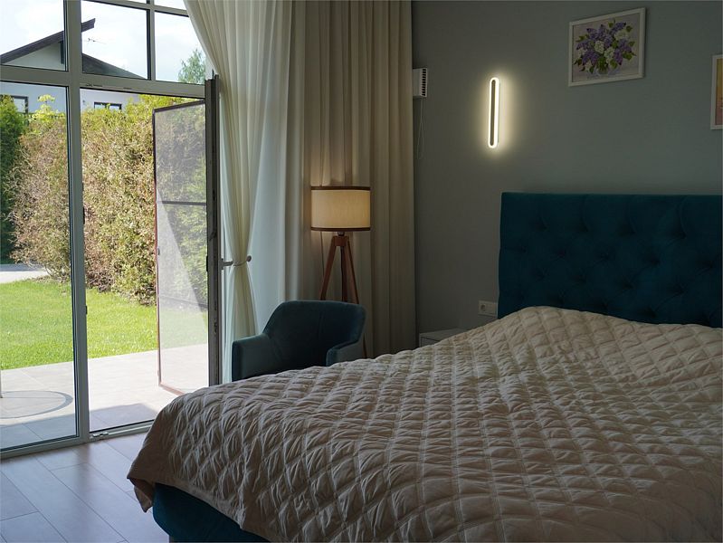 На первом этаже дома к услугам гостей просторная гостиная с мягкой зоной отдыха и большим телевизором, камином, столовая с панорамными окнами и террасой. На втором этаже уютная библиотека с выходом на видовой балкон.