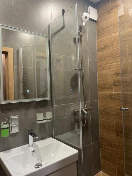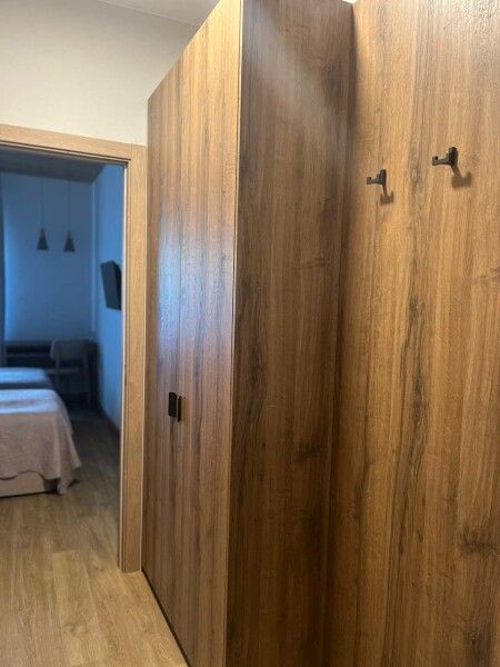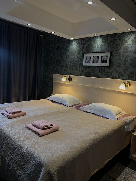 Две комнаты, две ванные комнаты, гардероб, зеркало, две двух спальные кровати в раздельных комнатах, барный комод, стол, стулья, две прикроватные тумбочки, санузел и душ в номере, ТВ, кухня, холодильник, микроволновка, плитка.