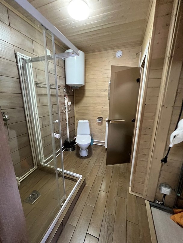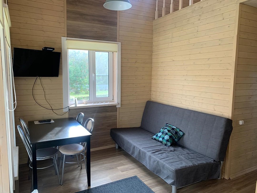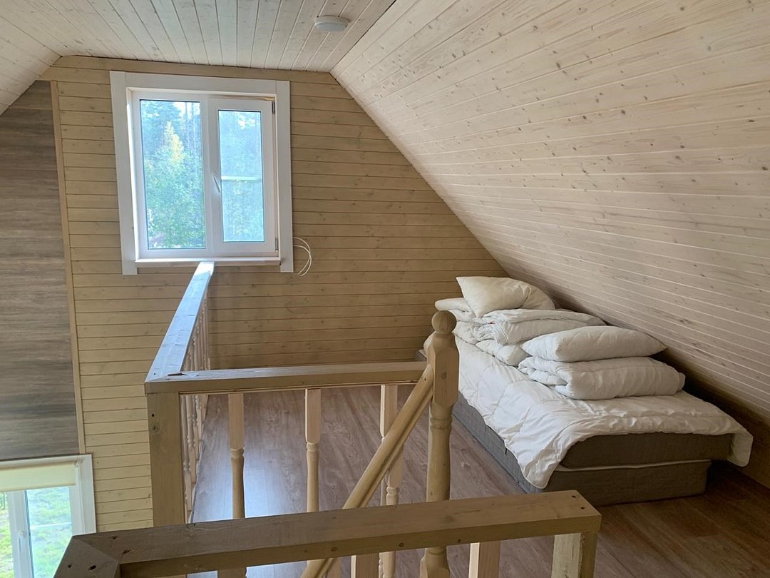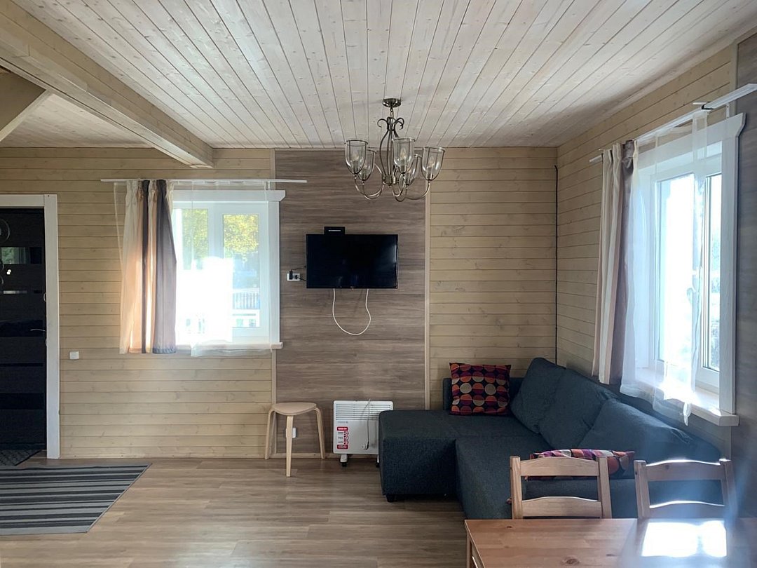 Дом с двумя спальнями и мансардой. На первом этаже находится гостиная с диваном, а также одна закрытая спальня с двуспальной кроватью и детской кроваткой, на втором этаже- мансарда с двумя односпальными местами и еще одна закрытая спальня с двуспальной кроватью. Также есть электрическая саунаДом с 2 спальнями