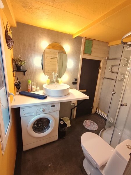 В доме есть две отдельные спальни и дополнительный раскладной диван на кухне, предоставляется постельное бельё и банные полотенца для каждого гостя. Установлены противомоскитные сетки на всех окнах, полы с подогревом во всём доме, Wi-Fi, два ТВ — эфирное и смарт-ТВ с «Алисой» и фильмами, Bluetooth колонка. Имеется душевая кабина, фен, стиральная машина, оборудованная кухня с холодильником, посудой и средствами для уборки и прочие мелочи, такие как гель для душа, соль, салфетки, туалетная бумага и т.д.