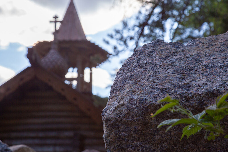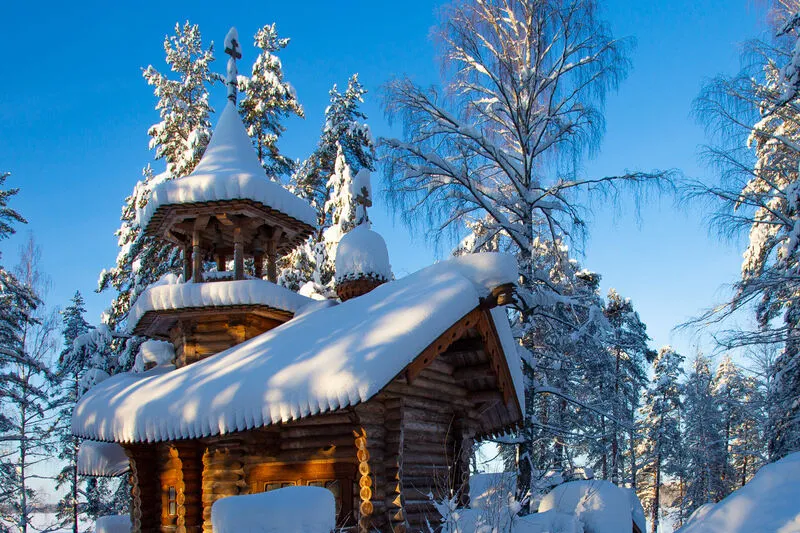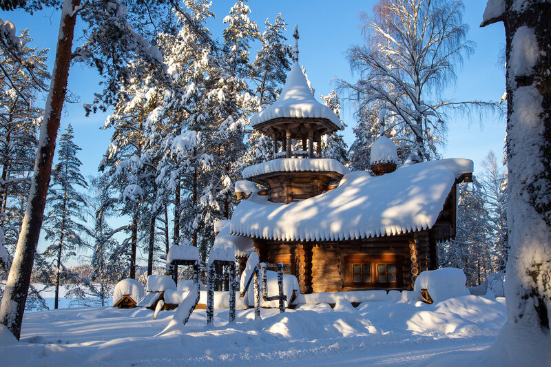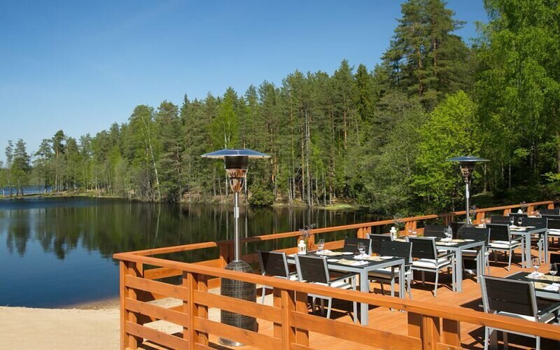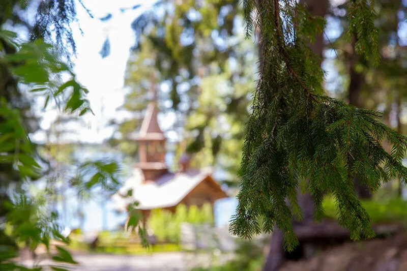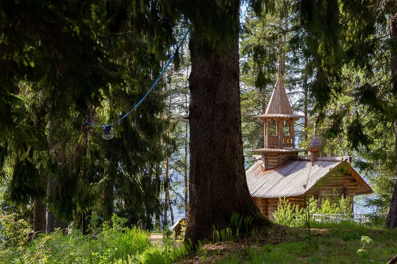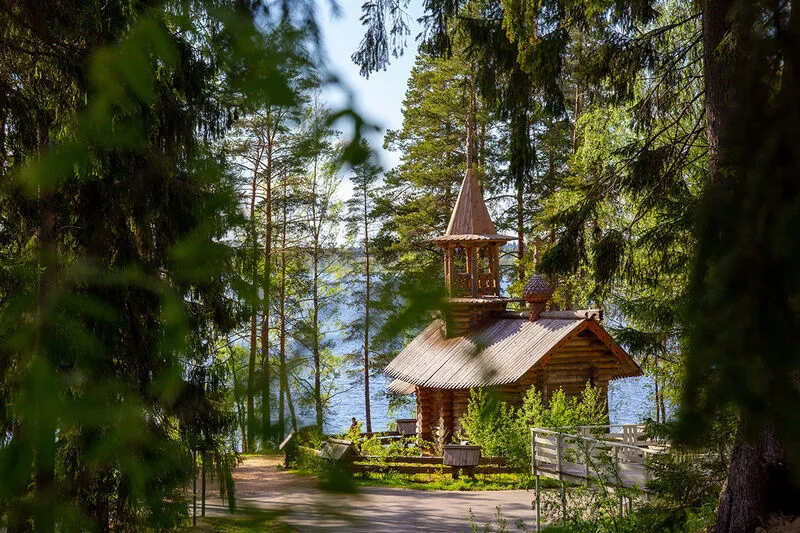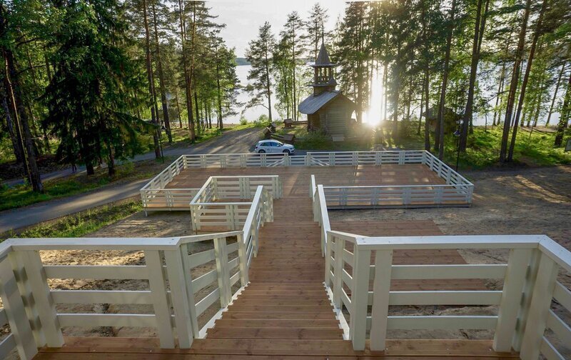 - панорамное остекление фасадной части зала с видом на озерную гладь, хвойный лес и старинную деревянную часовню;