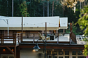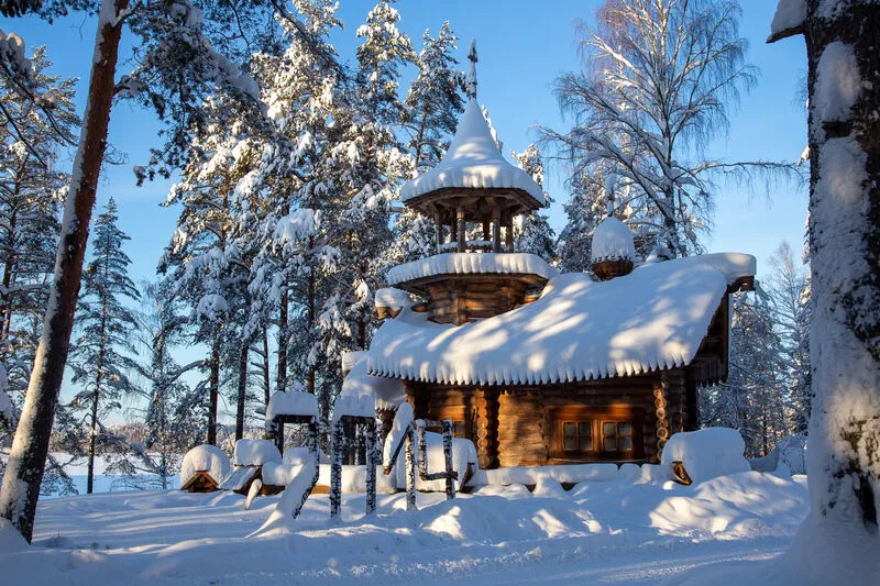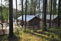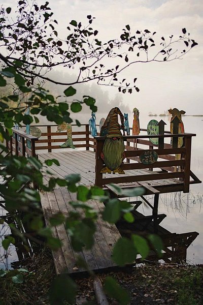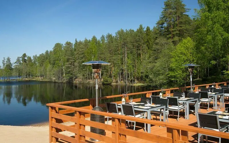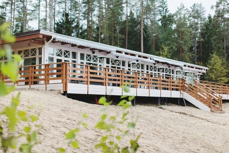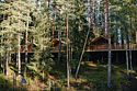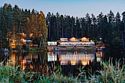 - красивое деревянное здание на живописном берегу лесного озера;