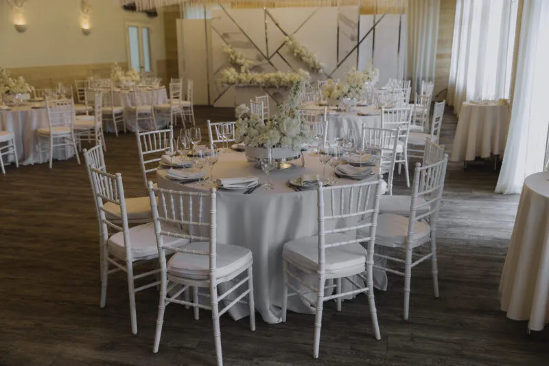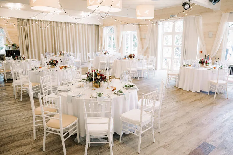 - банкетная мебель с различными вариантами накрытия и оформления: круглые или прямоугольные столы и дизайнерские итальянские стулья кьявари;