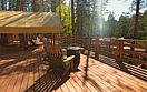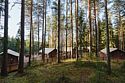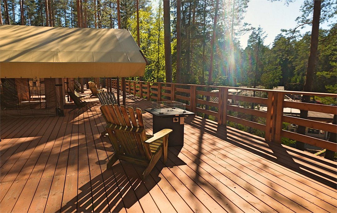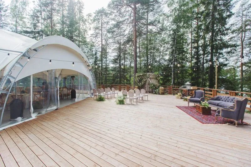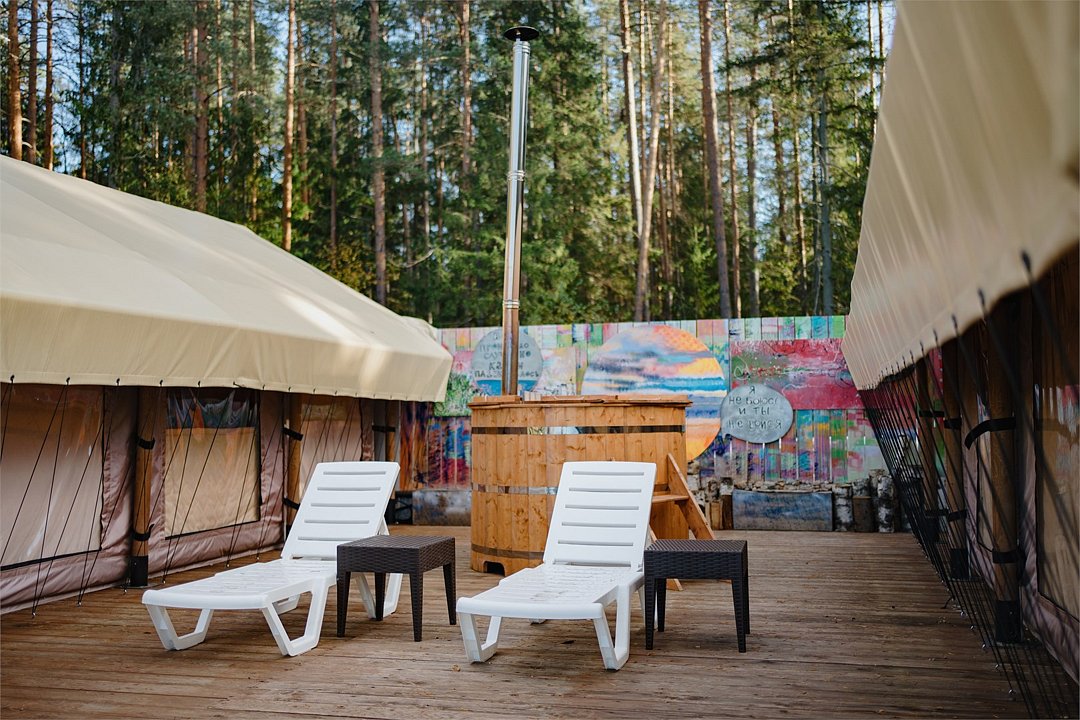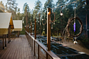 У каждого из лоджей есть небольшая закрытая зона для отдыха и релакса и общая просторная площадка с панорамным видом на тихое озеро и сосновый лес и конечно же, банные купели в окружении вековых сосен.