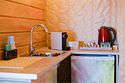 Внутри — king‑size кровать, тёплый пол, санузел и кухонный уголок. Снаружи — собственная терраса, купель( 1 топка купели входит в пакет проживания от 2-х ночей), мангальная зона и вид на сосновый лес