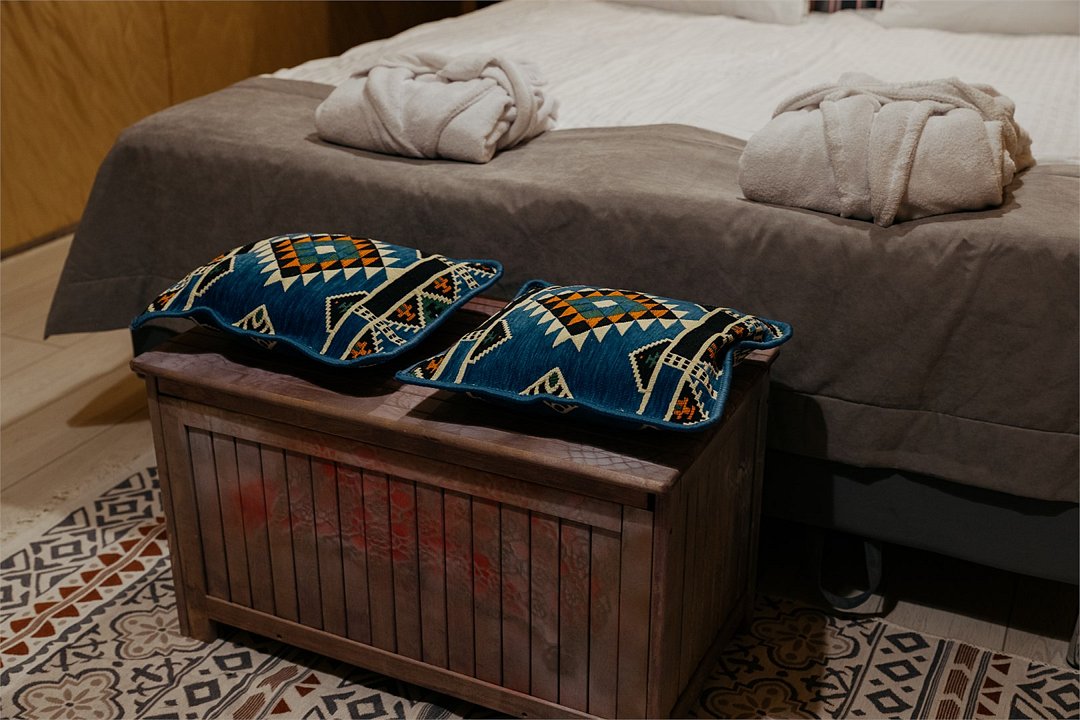 Просторный сафари-лодж с живописным видом на лесное озеро. Авторский дизайн интерьера, выполненный художником Ариной Чижиной, уникален для каждого сафари-лоджа и позволят сделать отдых «не скучным» и проникнуться особым «вайбом» эко-парка «Вереск».