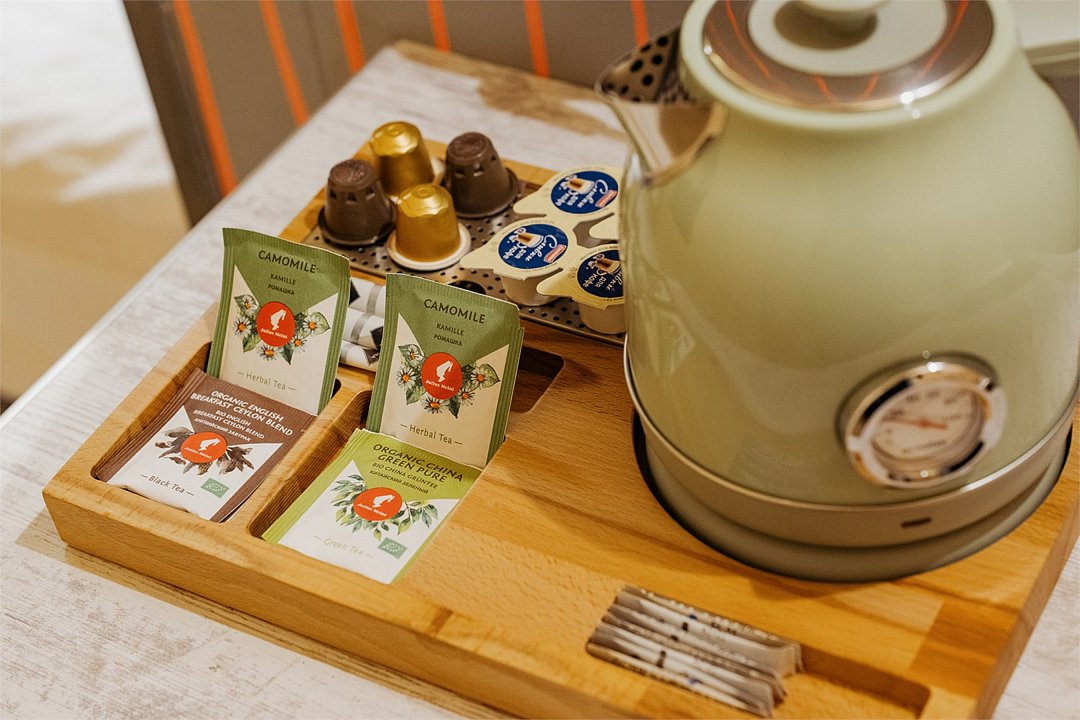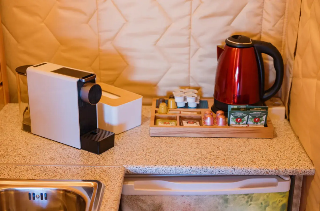 - мини кухня: раковина, чайно кофейная станция, посуда
