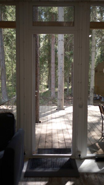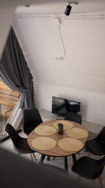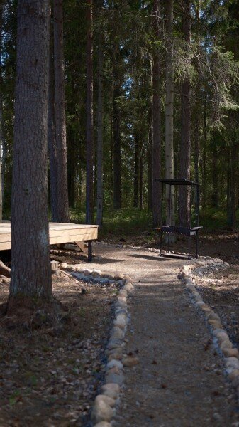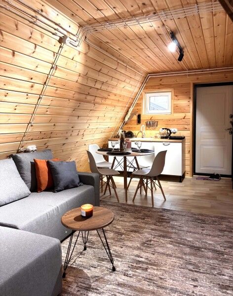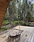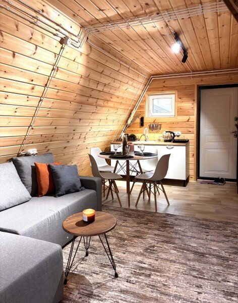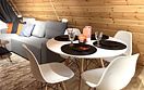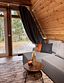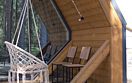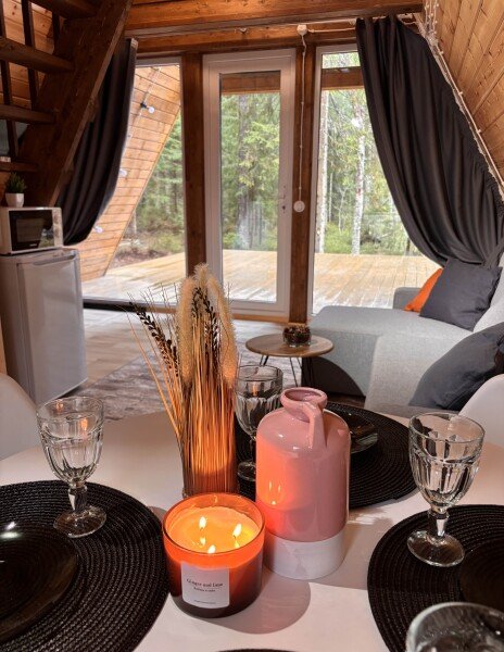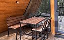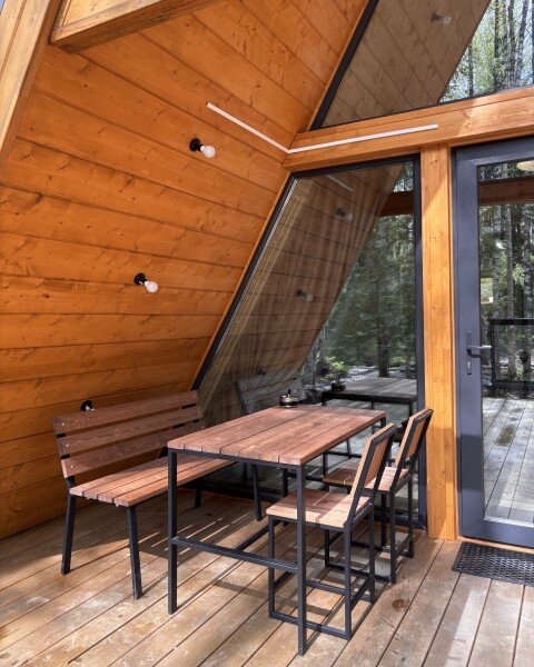 Всего в комплексе представлено шесть А-фреймов, рассчитанных на проживание от 2 до 6 человек. Каждый домик оснащен террасой с мангалом и зоной для отдыха, а панорамные окна открывают великолепный вид на лес.