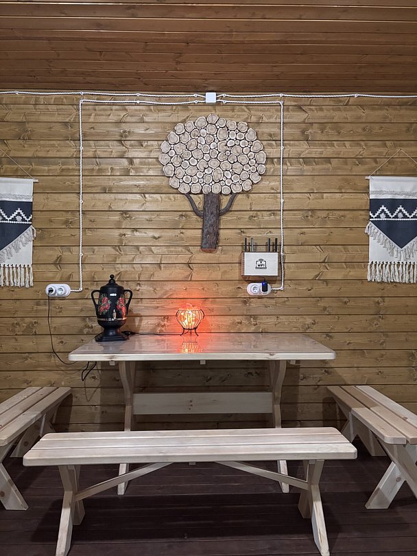 Веник, шапочки, чистые простыни, арома-масла и чай входят в стоимость. Вместимость бани до 6-и человек. Есть душевая и туалет.