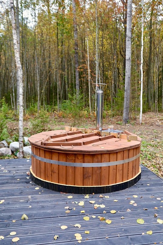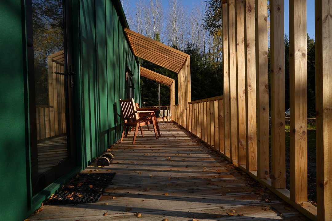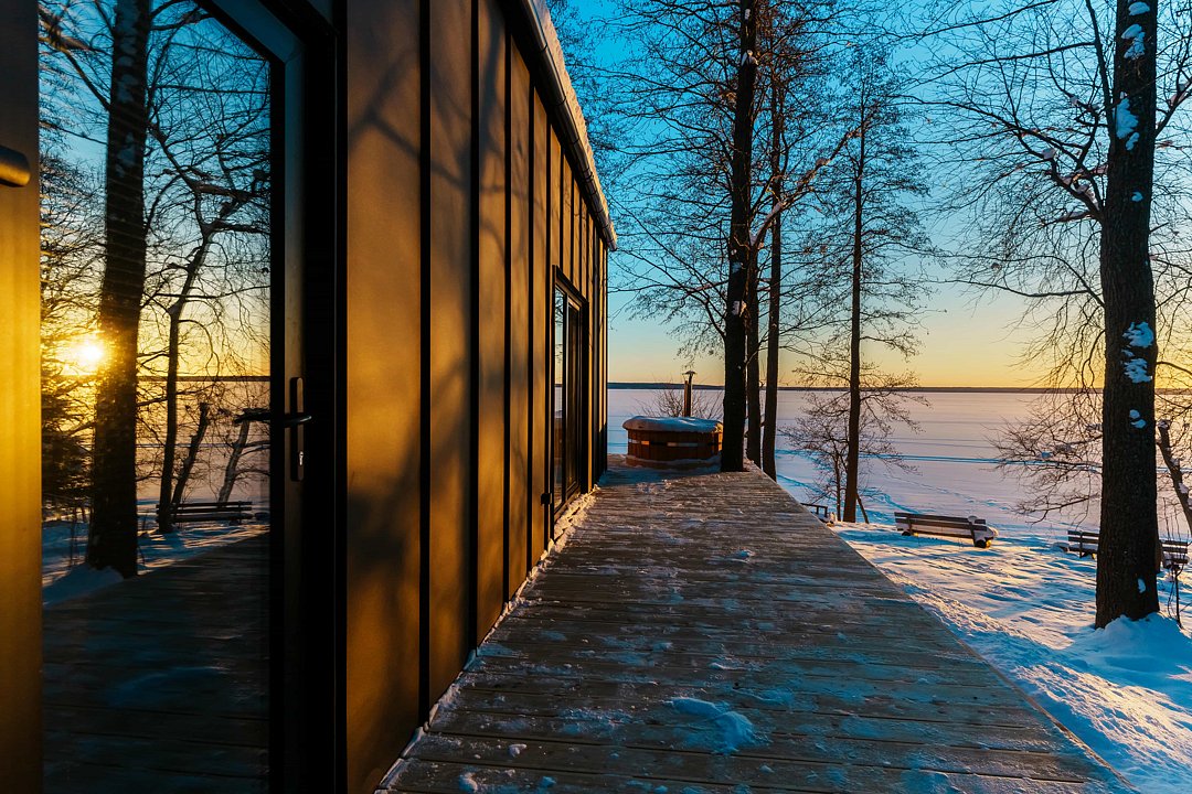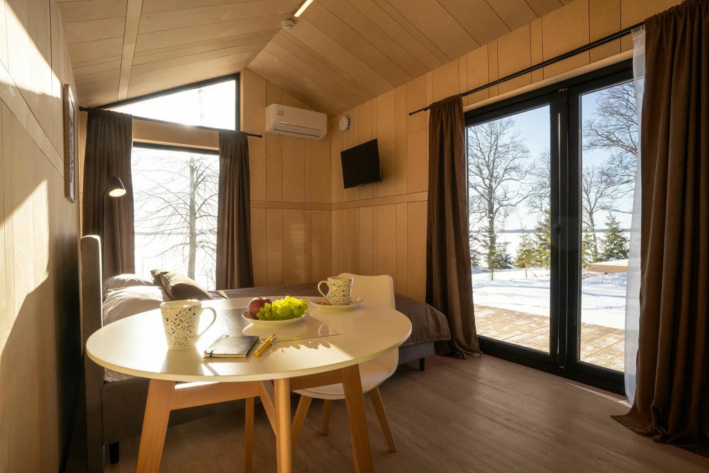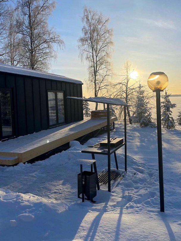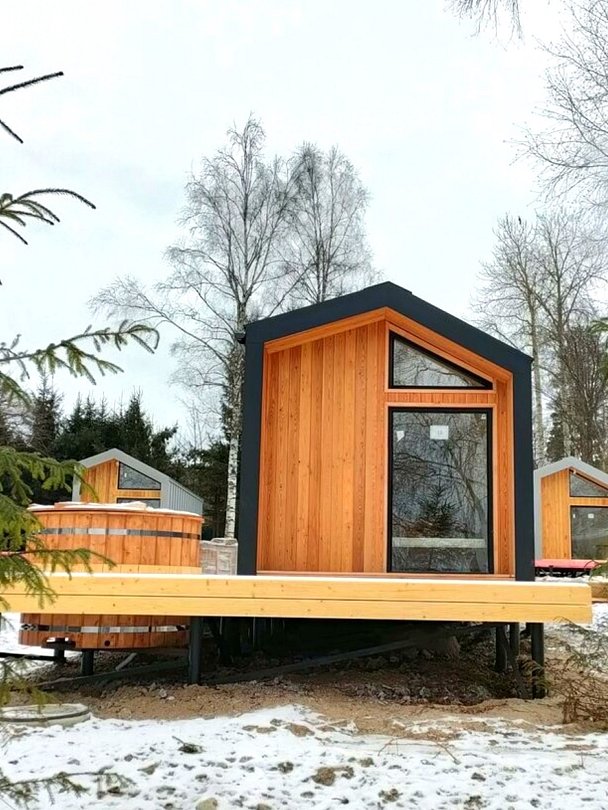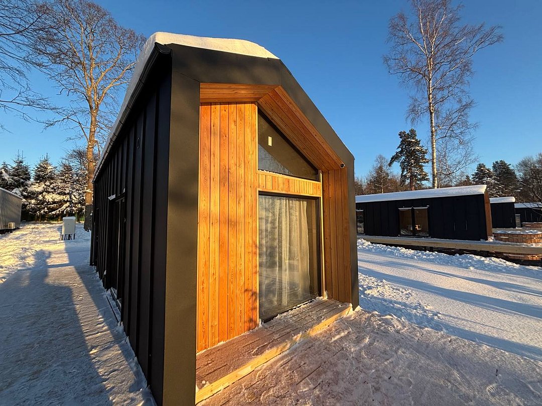 Для комфортного проживания для вас подготовлены стильные и уютные барнхаусы с панорамными окнами. В каждом из них есть оснащенная кухня, ванная комната и собственная купель на террасе. Также имеется телевидение и Wi-Fi.