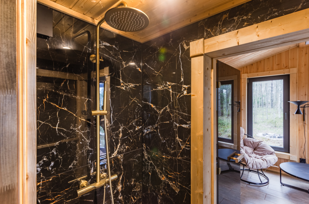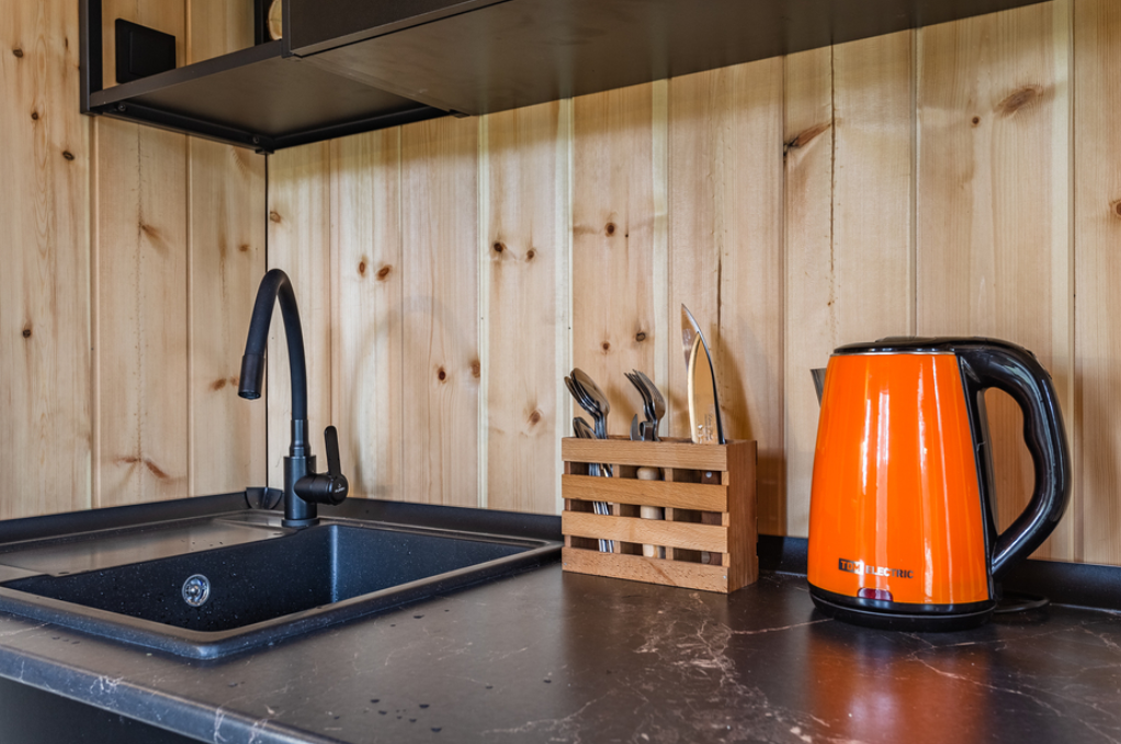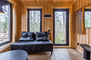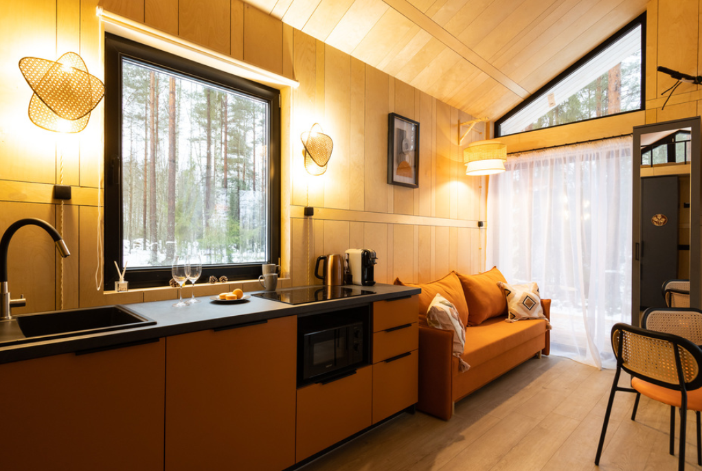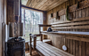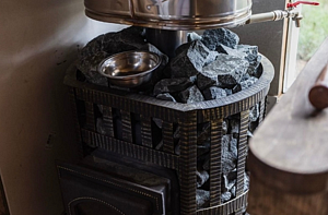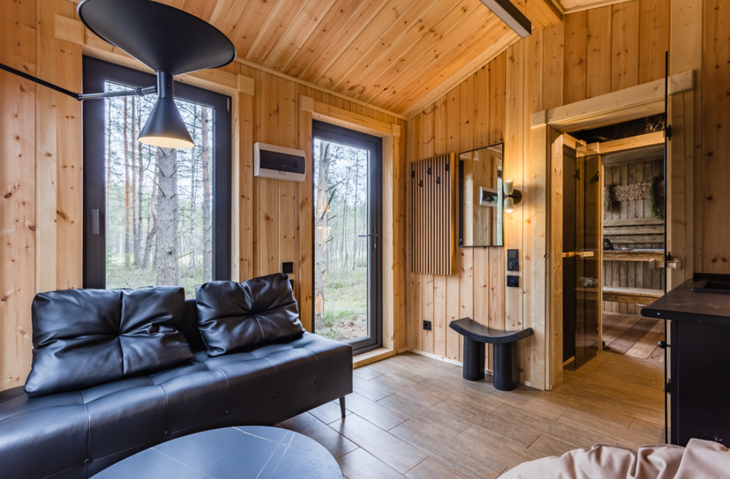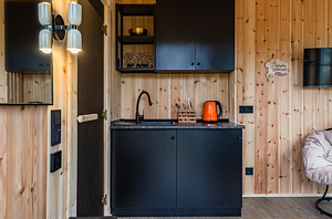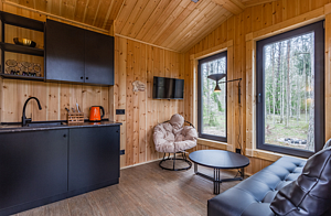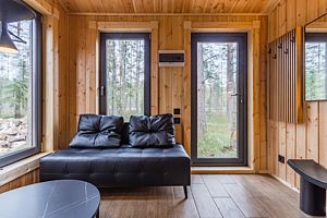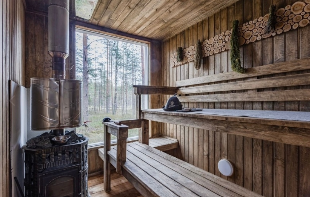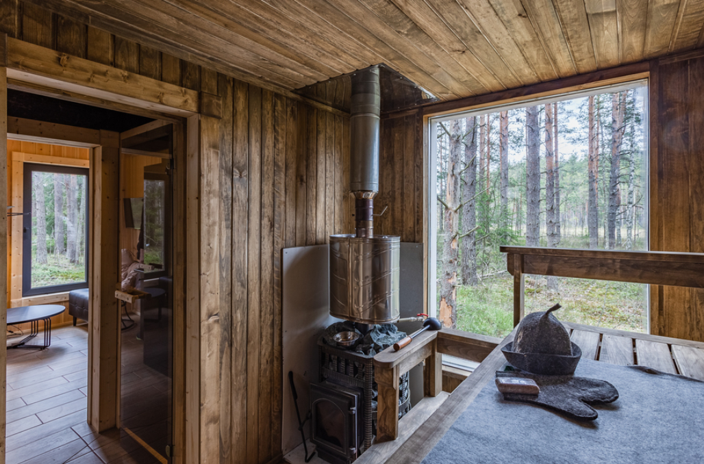 В просторной парной стоит печь-каменка с деревянными полками разных высот для комфортного выбора температуры. Есть ковши, веники и ведра с водой. Рядом — комната отдыха с удобным диваном, мягким креслом, кухней и панорамными окнами. Для досуга предусмотрена зона с телевизором. Баня также оснащена душем с тёплой водой и туалетом. Окна комнаты отдыха открывают красивый вид на природу.