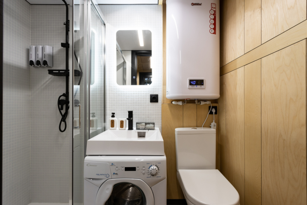 - техника: TV, высокоскоростной Wi-Fi, стиральная машина, фен, утюг, тёплый пол;