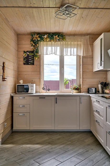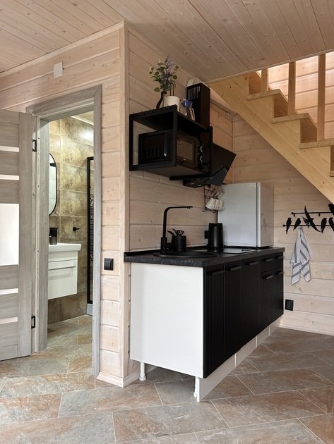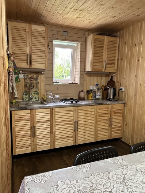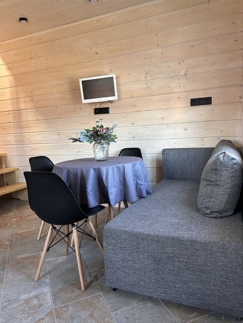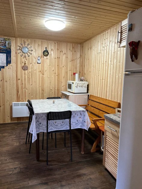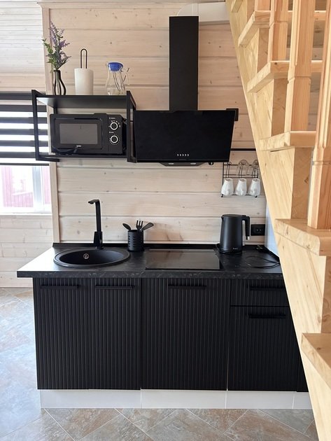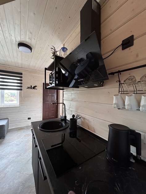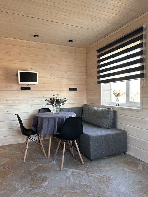Домик площадью 50 кв. м полностью оборудован для комфортного пребывания 4 человек. Просторная кухня со всей необходимой техникой (варочная панель, СВЧ, минихолодильник, кофеварка, электрический чайник, вытяжка), круглый обеденный стол, столовая посуда и приборы на 4 персоны.