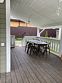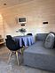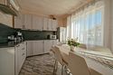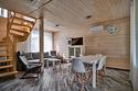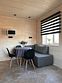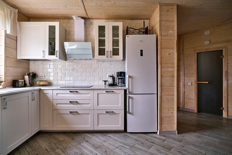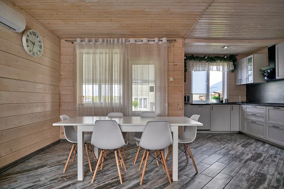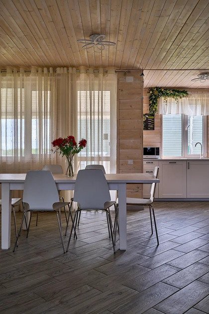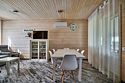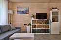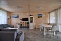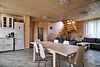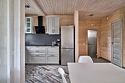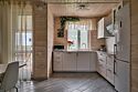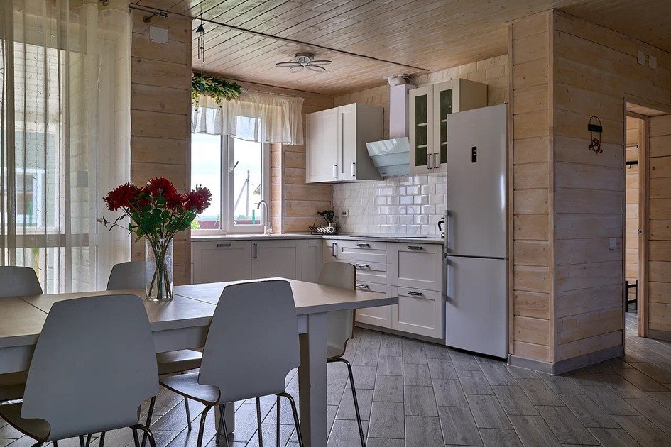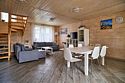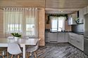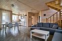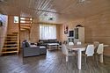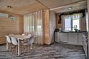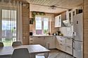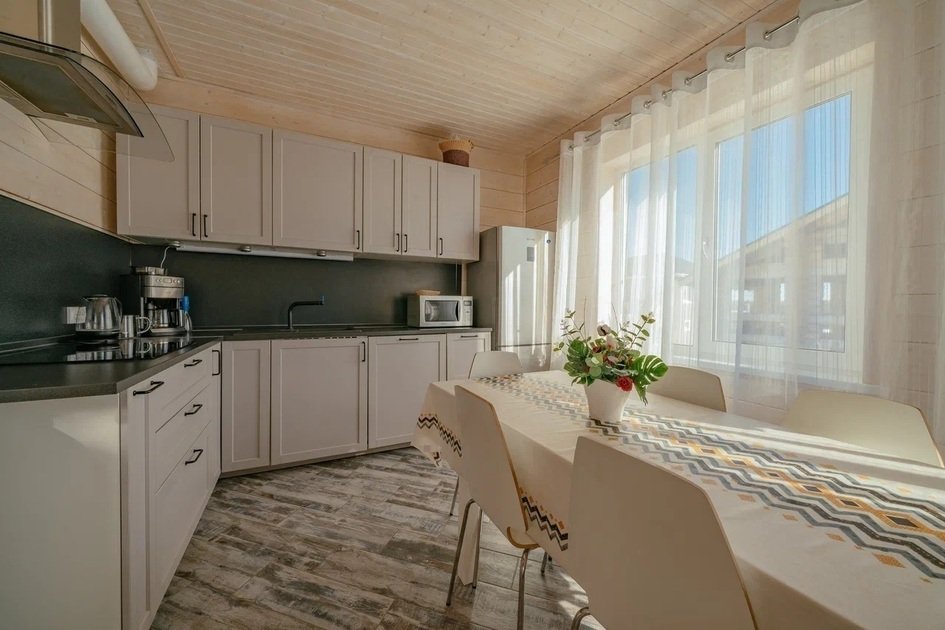 Площадь данного коттеджа составляет 121 кв. м, он полностью оборудован для комфортного пребывания: просторная кухня со всей необходимой техникой (варочная панель, СВЧ, ПММ, холодильник, кофеварка, электрический чайник, вытяжка), большой обеденный стол, стулья для 9 гостей и открытая терраса, имеющая выход из гостиной комнаты.