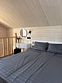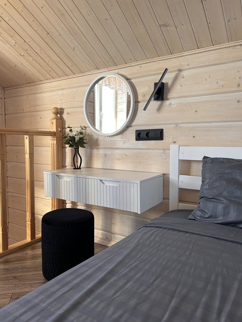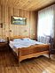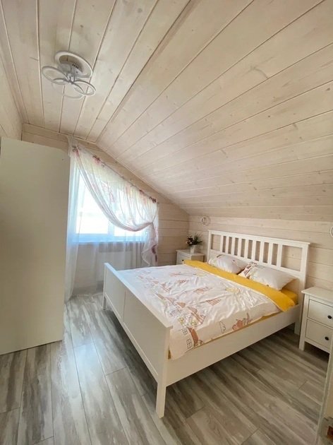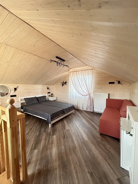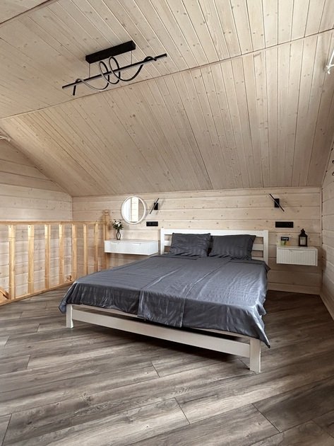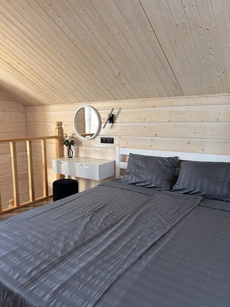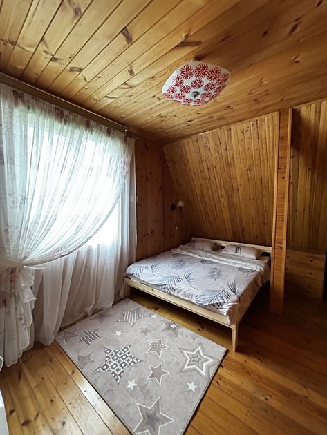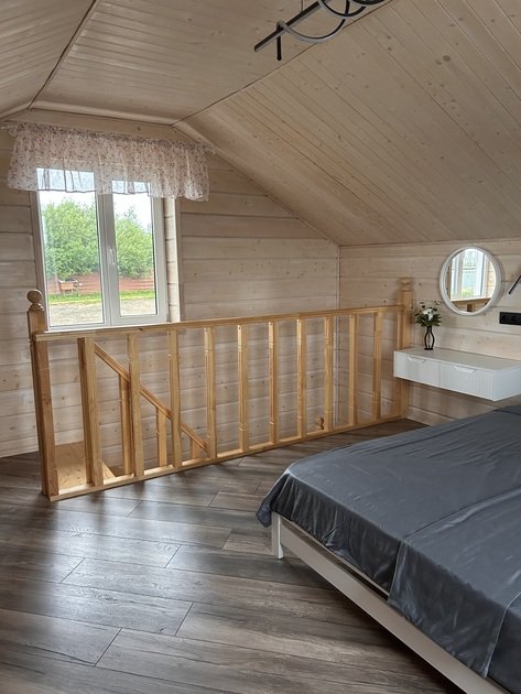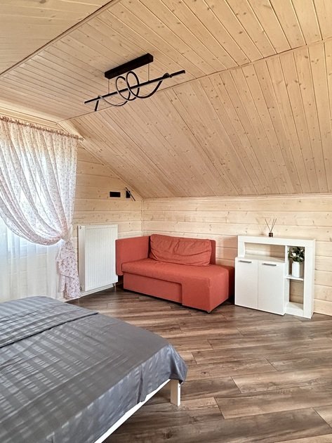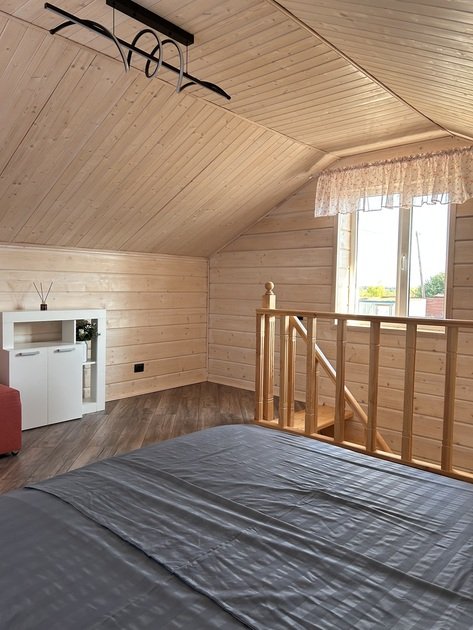 В данном коттедже на первом этаже располагается просторная кухня-гостиная с раскладным односпальным диваном. На втором этаже в спальне двуспальная кровать и раскладной односпальный диван. По запросу предоставляем кроватку для младенца.