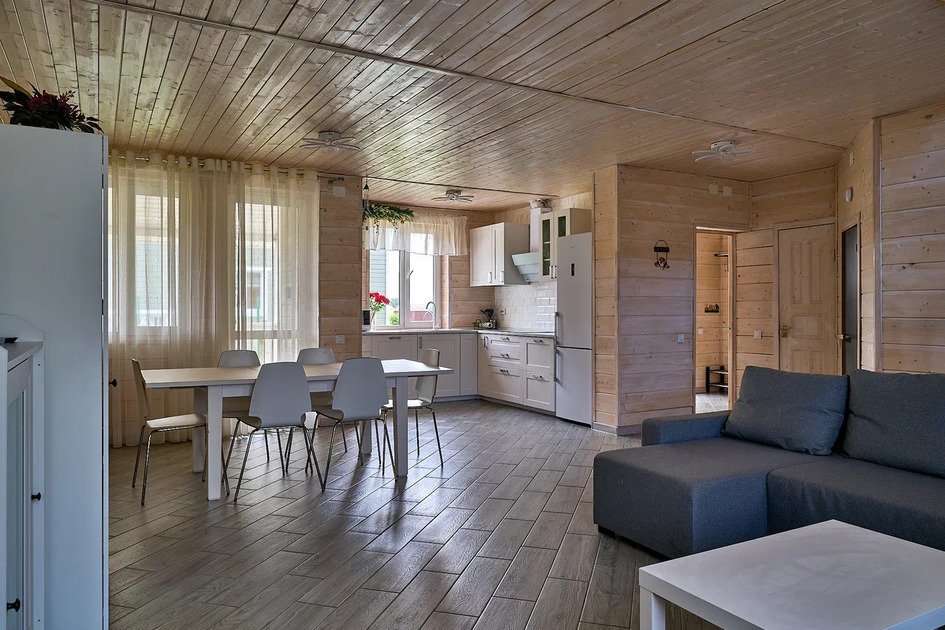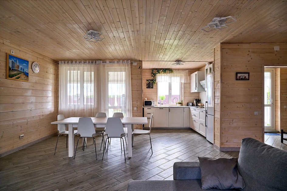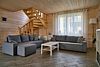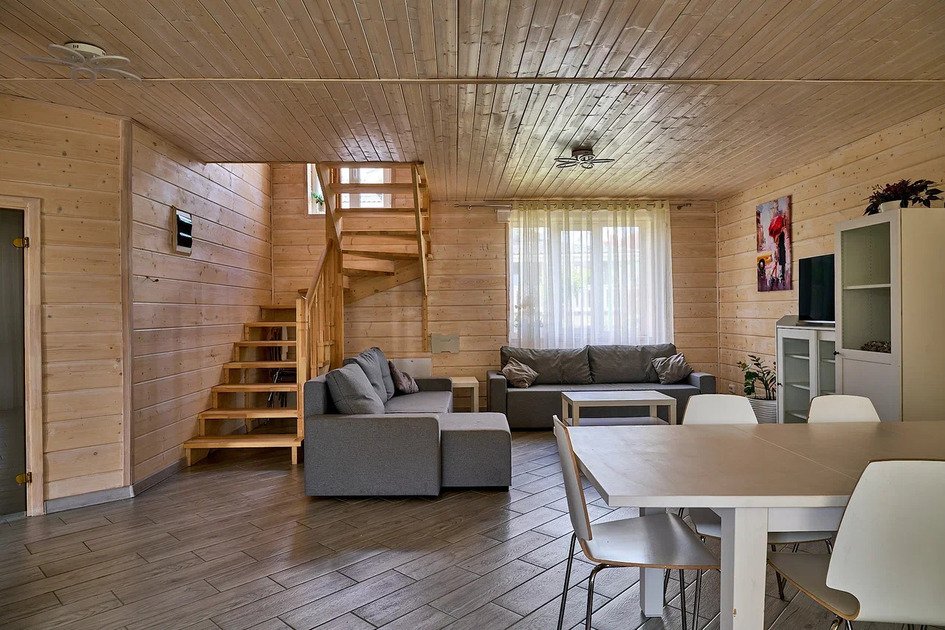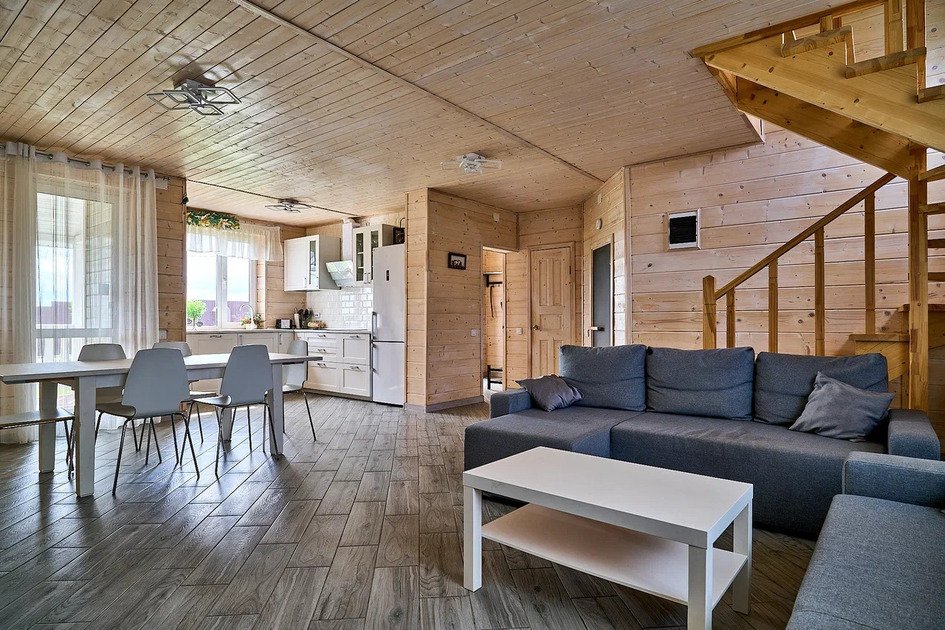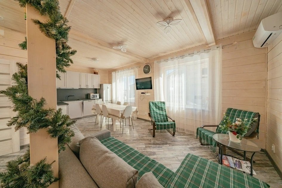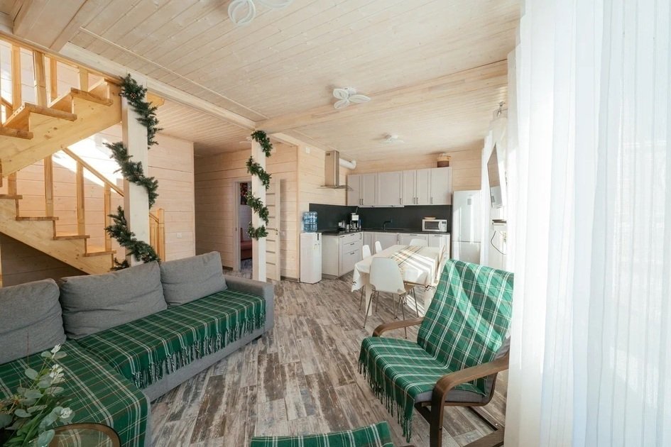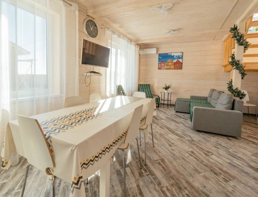 На первом этаже коттеджа располагается просторная гостиная с двумя удобными диванами, мягкой мебелью и телевизором, где можно расслабиться или поиграть в настольные игры. Диваны могут использоваться как дополнительные спальные места. Гостиная совмещена с зоной кухни. На кухне имеется вся необходимая бытовая техника (варочная панель, вытяжка, холодильник, кофеварка и чайник, СВЧ и ПММ) и посуда для приготовления пищи, а также столовая посуда и приборы. Большой обеденный стол уместит компанию до 12 человек.