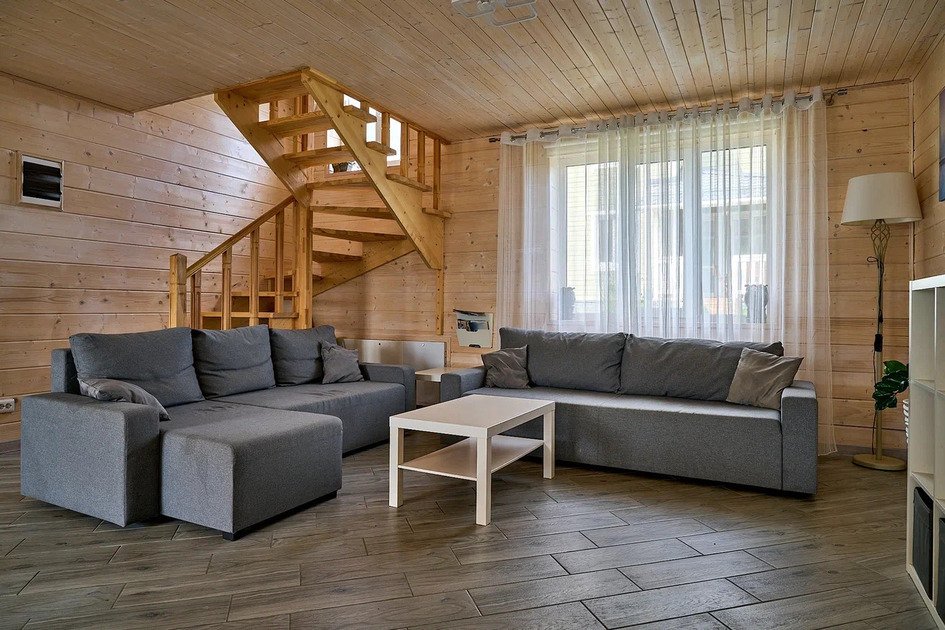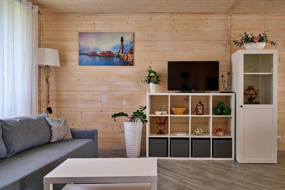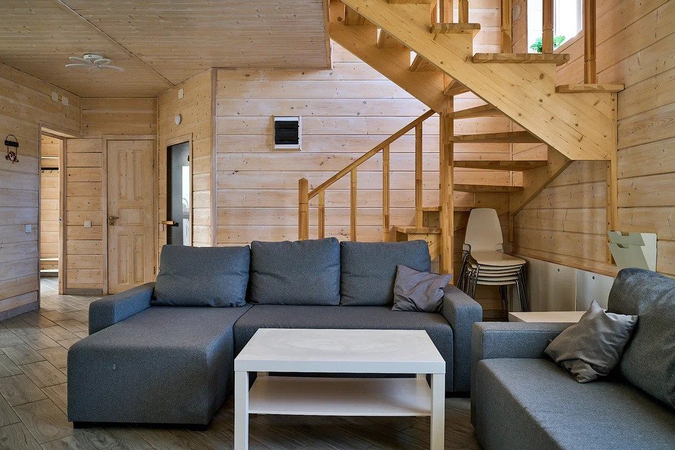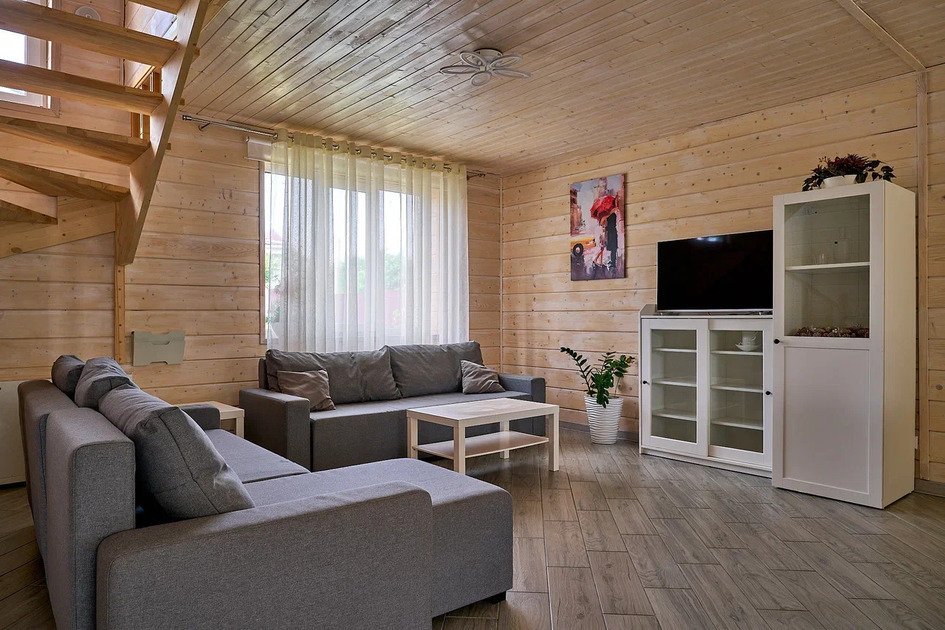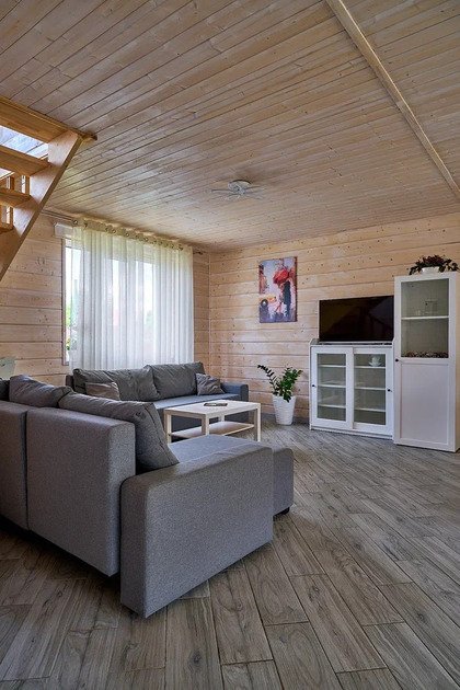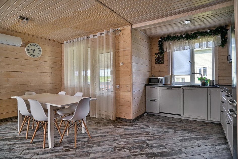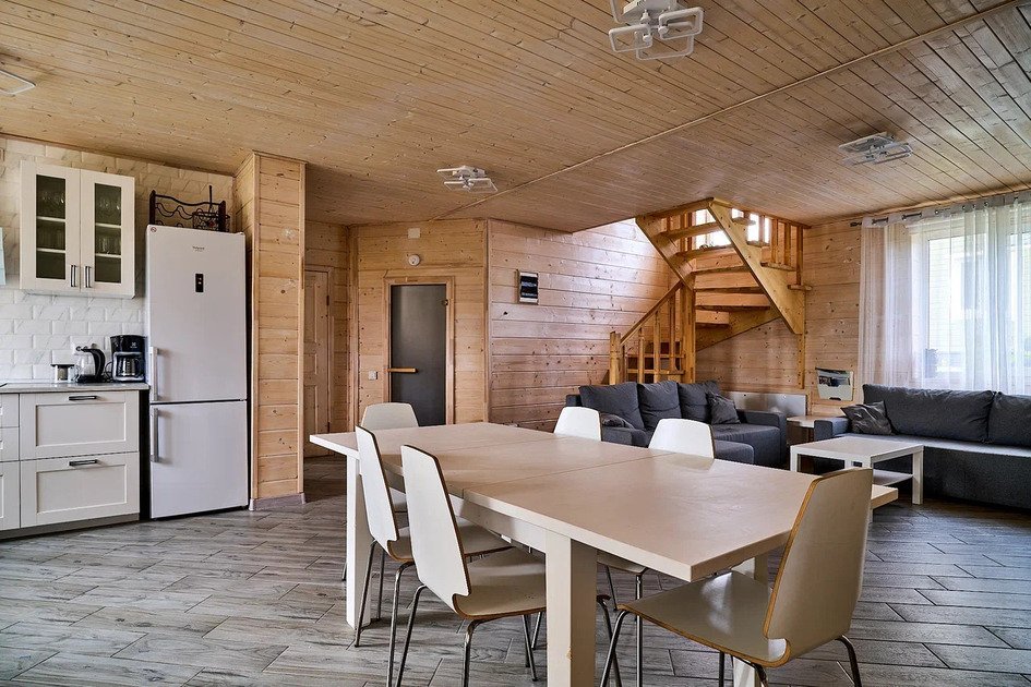 Комфортабельный новый двухэтажный коттедж с 4 спальнями и дровяной сауной — это просторное и уютное место, идеальное для отдыха в кругу семьи или друзей.