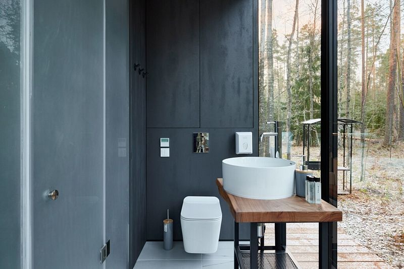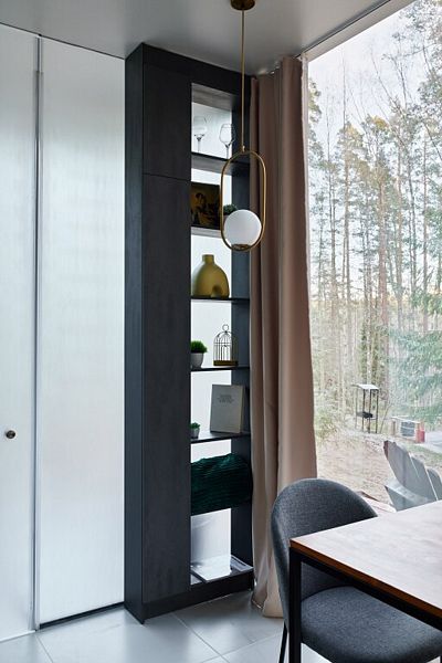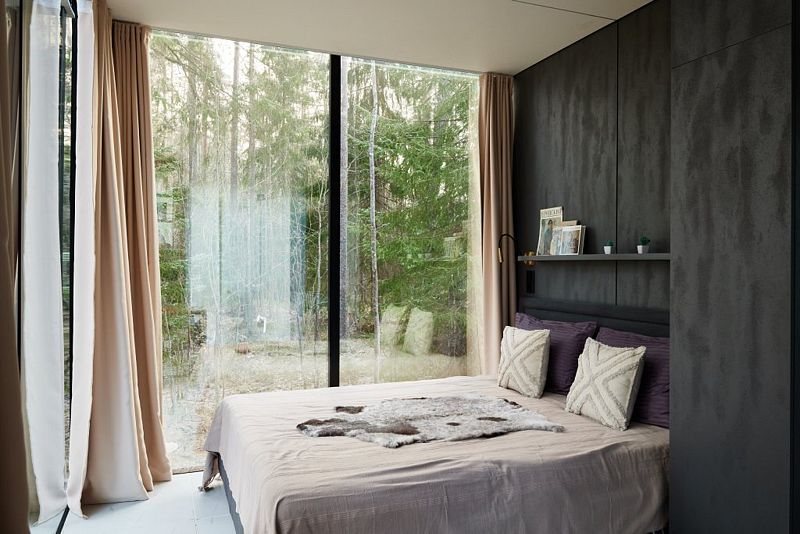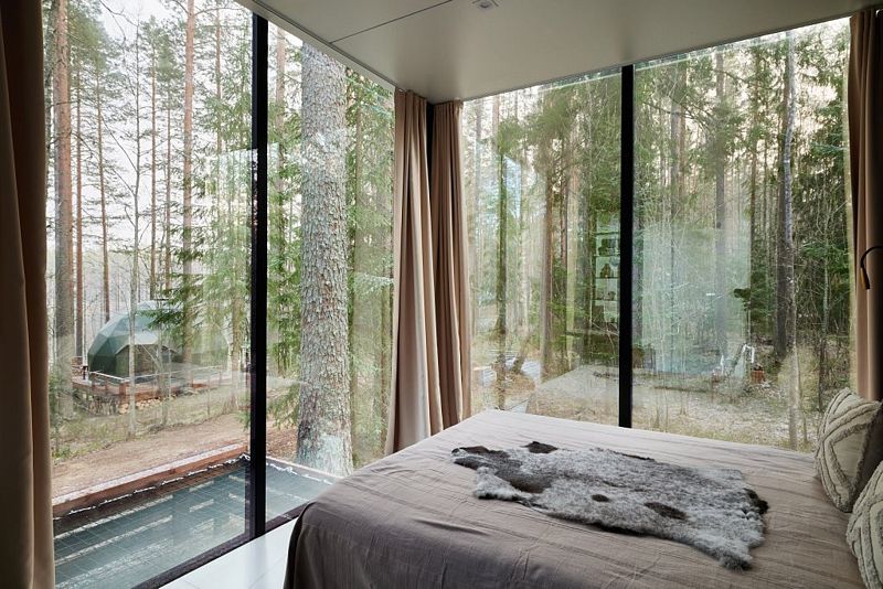 - большие панорамные зеркальные окна с трех сторон дома с видом на волшебный лес